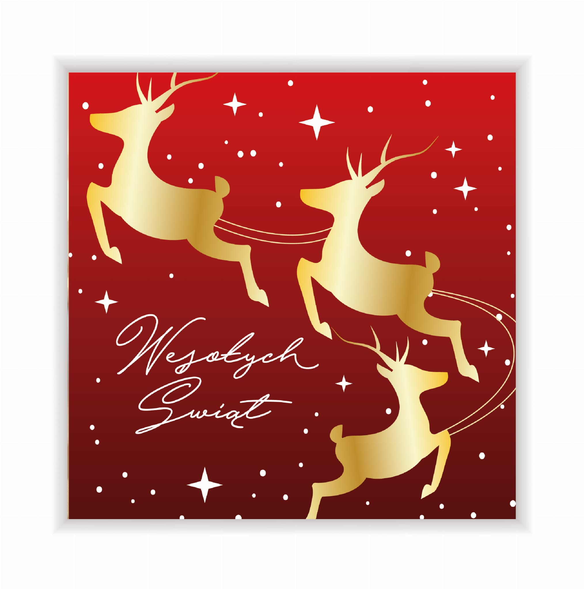 Ta elegancka kartka świąteczna to klasyka w nowoczesnym wydaniu. Na tle głębokiej czerwieni widnieją trzy złote renifery pędzące pośród śnieżnych gwiazdek – symbol radości, ciepła i magii Świąt Bożego Narodzenia. Złociste akcenty pięknie kontrastują z tłem, nadając kartce wyjątkowego, świątecznego blasku.