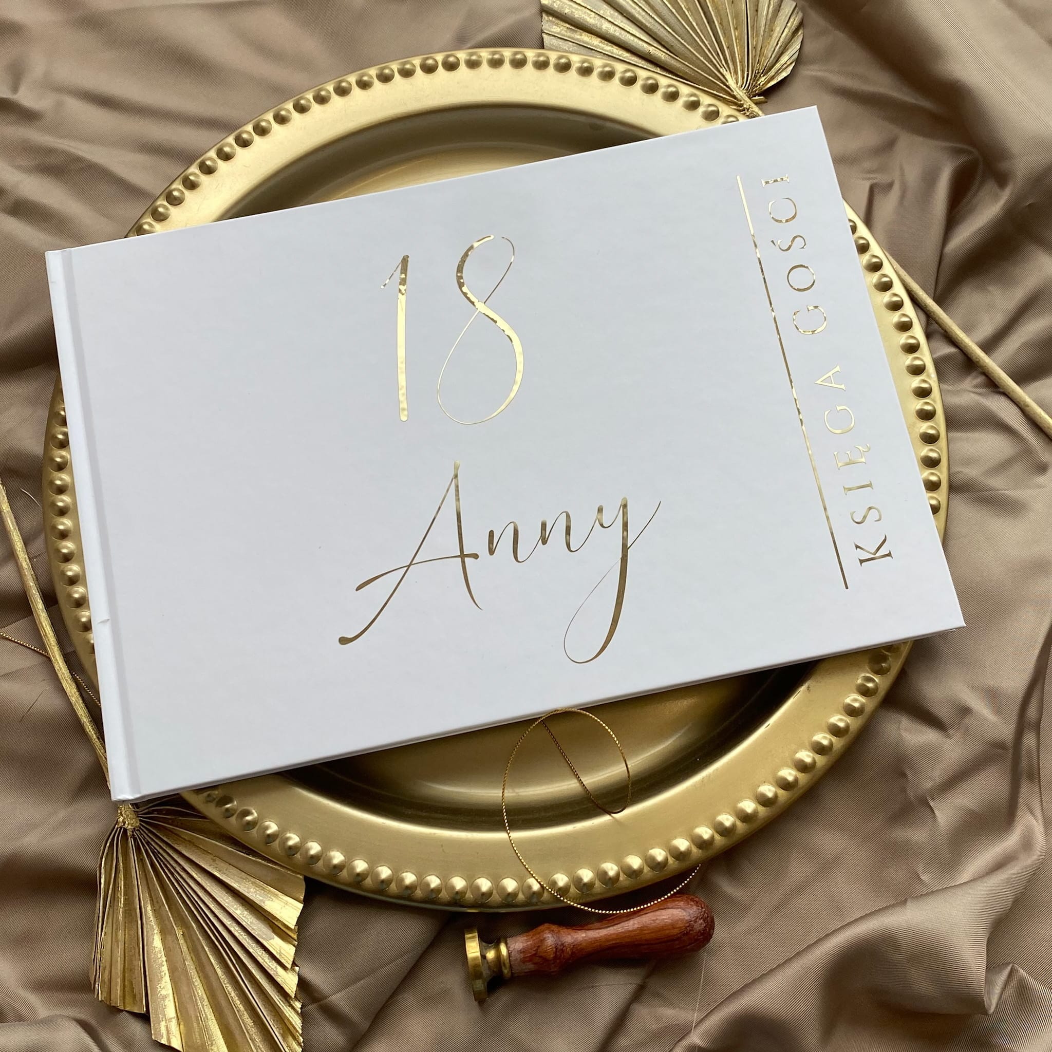 Ta personalizowana księga gości to nie tylko wyjątkowa pamiątka z 18. urodzin, ale także piękny dodatek do dekoracji stołu. Wykonana w twardej oprawie z eleganckim złotym napisem – liczba „18”, imię solenizantki oraz pionowy napis „Księga Gości”. Minimalistyczna, ale bardzo efektowna forma.
