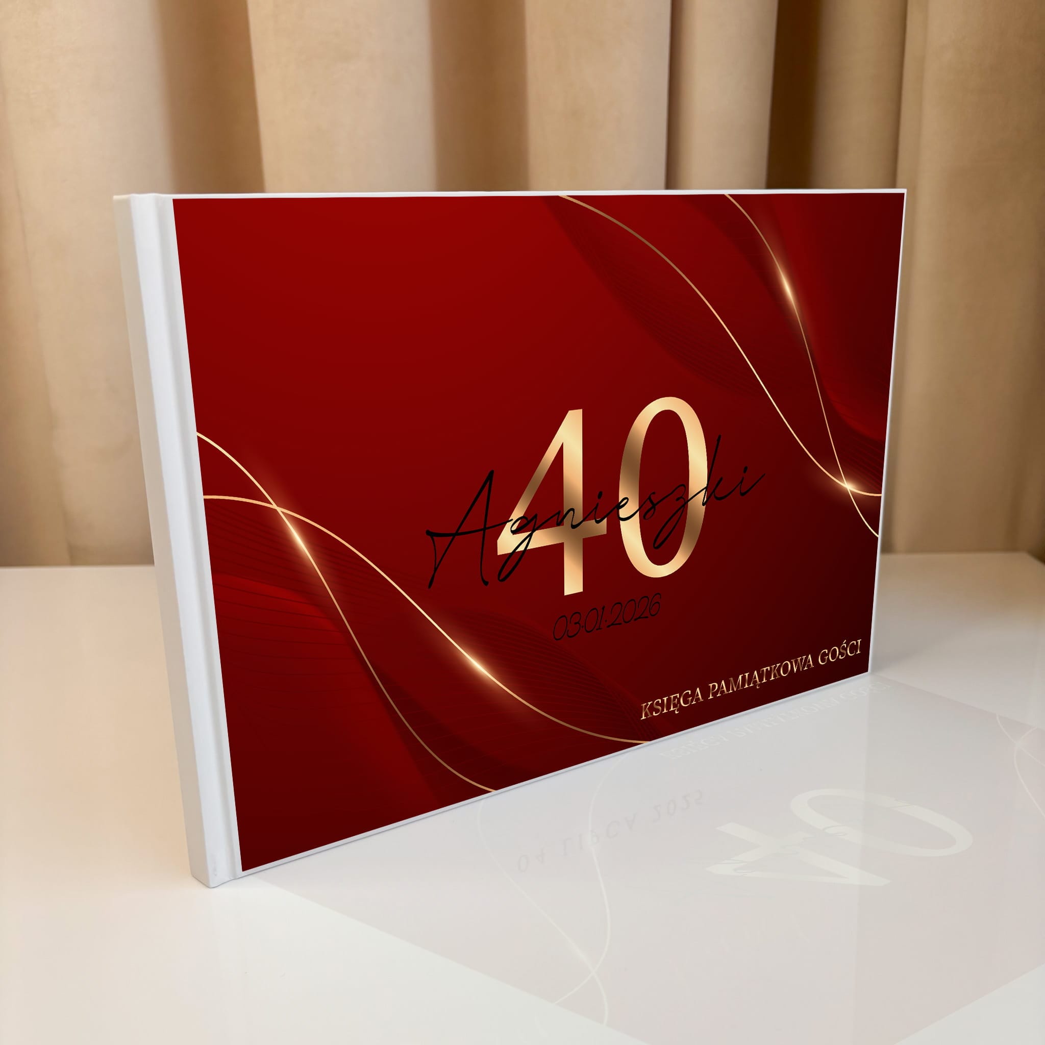 Elegancka księga pamiątkowa gości to wyjątkowy dodatek na każdą uroczystość urodzinową. Głęboka, czerwona okładka z subtelnymi złotymi zdobieniami i nowoczesnym wzornictwem sprawia, że księga prezentuje się stylowo i luksusowo.