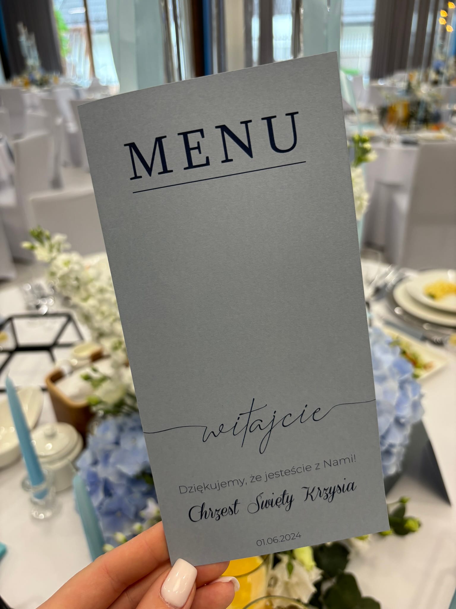 Personalizowane menu na stół na Chrzest Święty to elegancki dodatek, który pełni jednocześnie funkcję praktyczną i dekoracyjną. Model utrzymany jest w nowoczesnym, minimalistycznym stylu, dzięki czemu świetnie wpisuje się w jasne, subtelne i klasyczne aranżacje przyjęcia. Stonowany niebieskoszary kolor papieru pięknie współgra z prostym czarnym nadrukiem, tworząc spokojną i bardzo estetyczną całość.