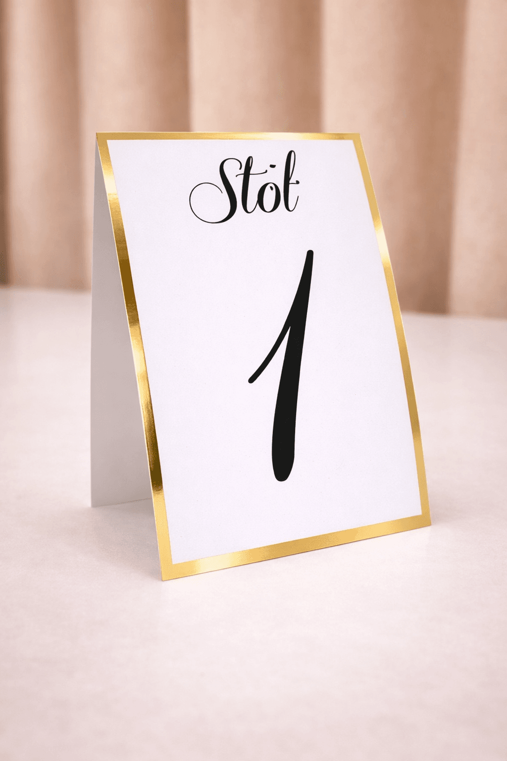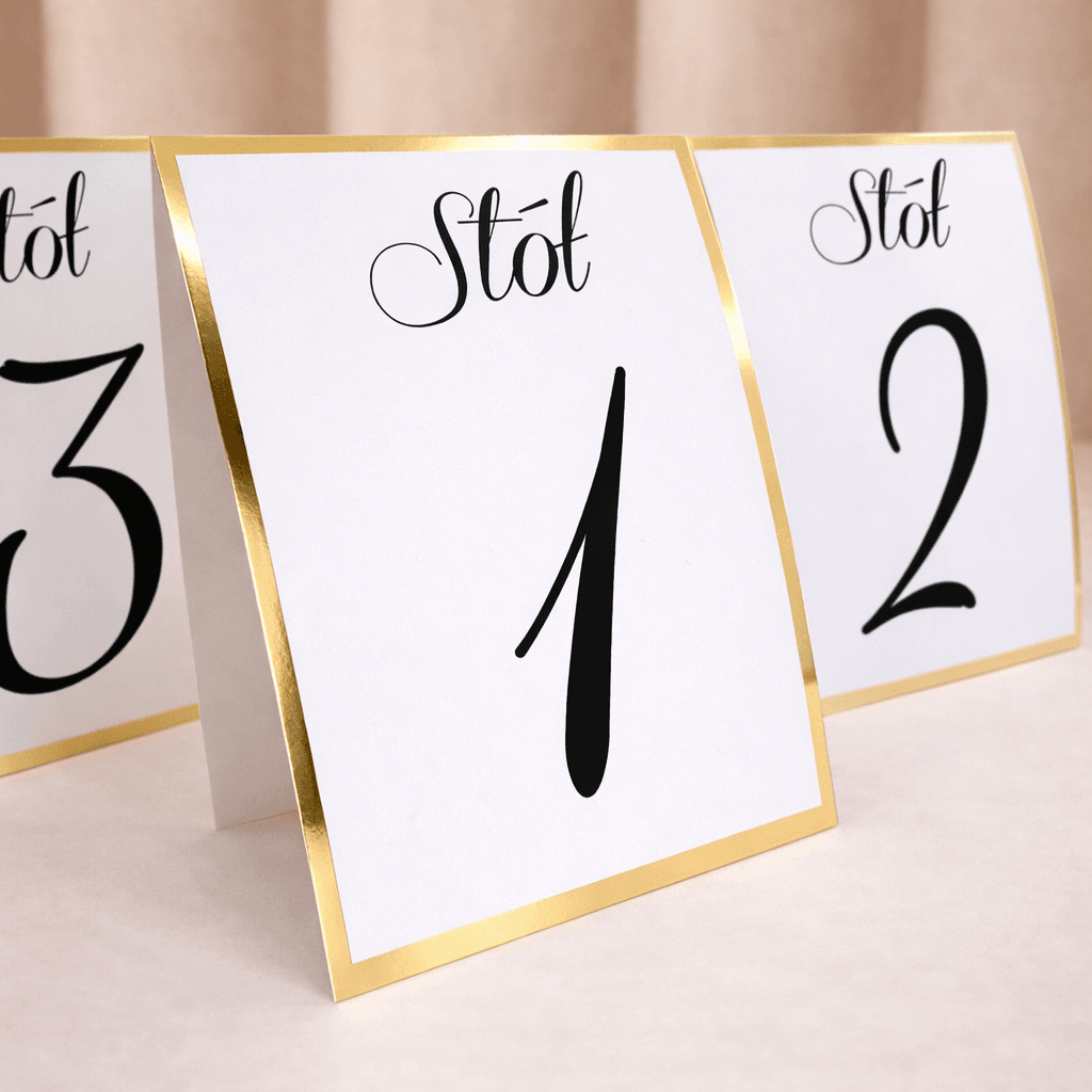 Minimalistyczny układ z delikatnym napisem „Stół” i dużą, czytelną cyfrą sprawia, że numer jest dobrze widoczny na stole, a przy tym wygląda lekko i estetycznie. Połączenie bieli, czerni i złota świetnie wpisuje się w wesela glamour, klasyczne, nowoczesne i eleganckie przyjęcia rodzinne.