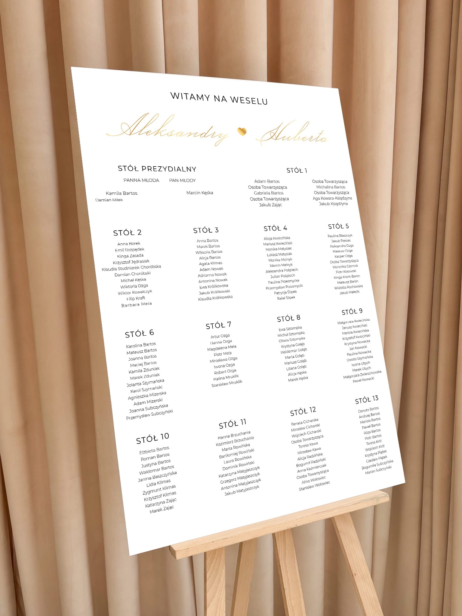 Dzięki przejrzystemu rozmieszczeniu stołów i gości, tablica doskonale spełnia swoją funkcję organizacyjną, jednocześnie będąc spójną częścią dekoracji weselnej. Złote imiona na górze dodają uroczystego charakteru, a całość świetnie prezentuje się zarówno na tle sali, jak i w plenerze.