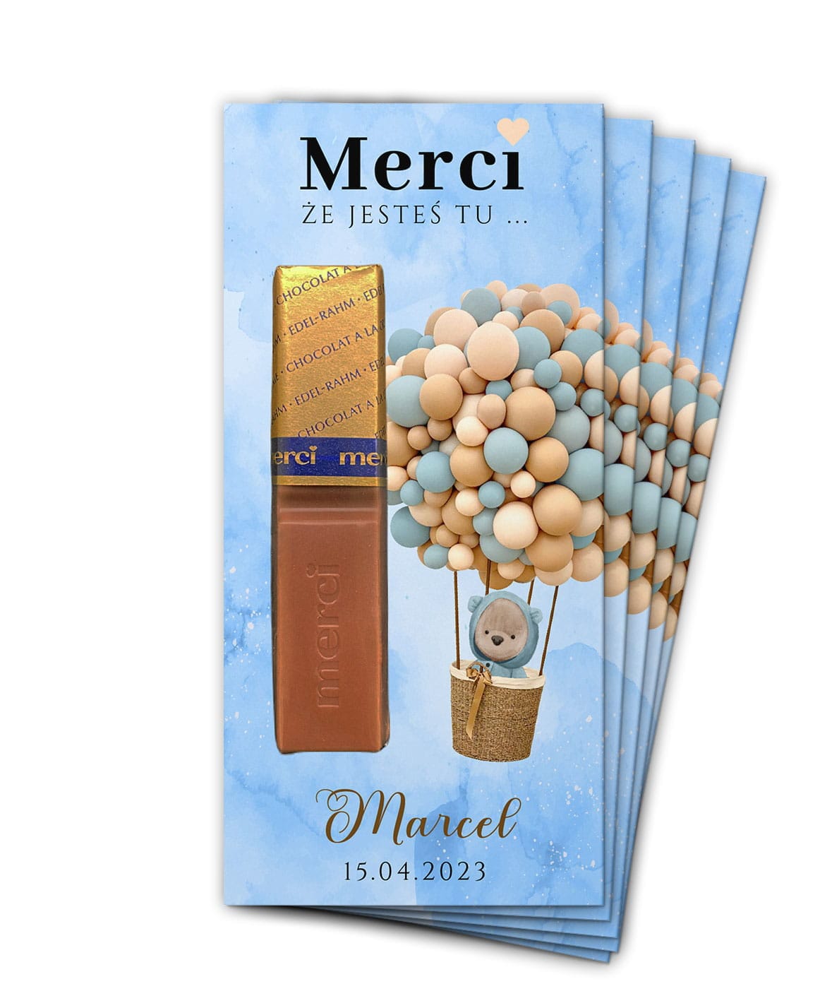 To wyjątkowe podziękowanie z miejscem na czekoladkę Merci to idealny dodatek do przyjęcia z okazji narodzin, chrztu, roczku czy baby shower. Niebieska akwarelowa grafika z balonami i misiem w koszu nadaje projektowi bajkowego charakteru, który zachwyci każdego gościa – dużego i małego.