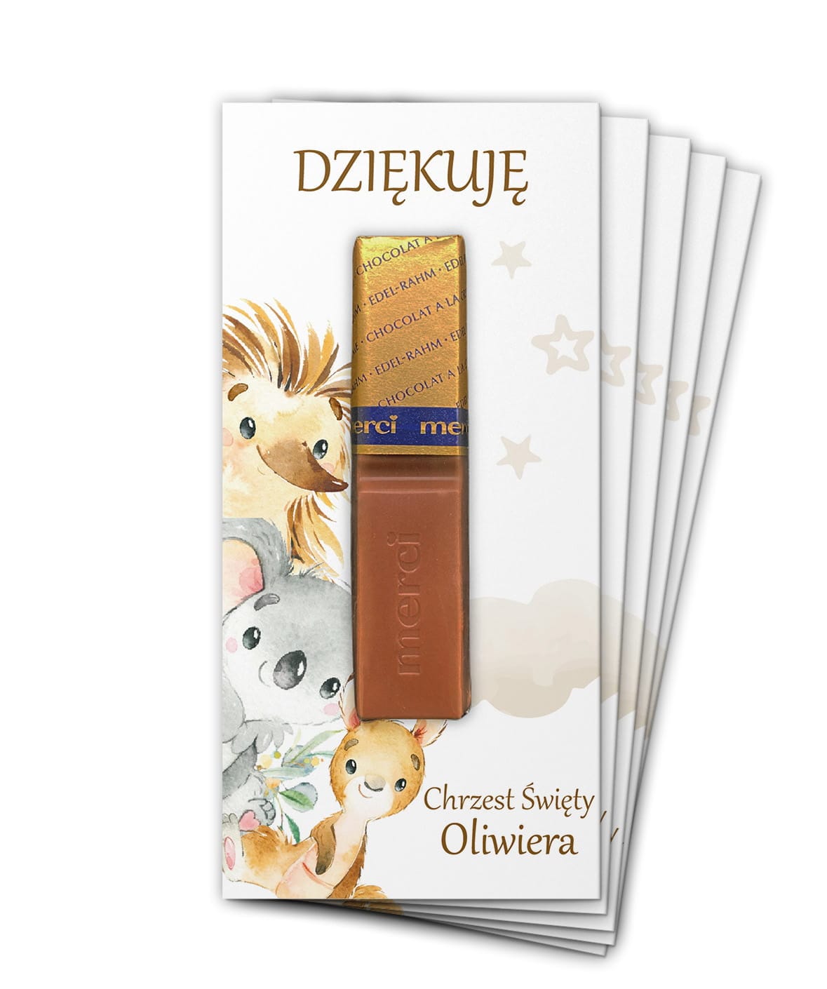 Urocze podziękowanie dla gości z kolekcji zwierzątek leśnych – idealne na Chrzest Święty, Roczek lub Komunię Świętą.