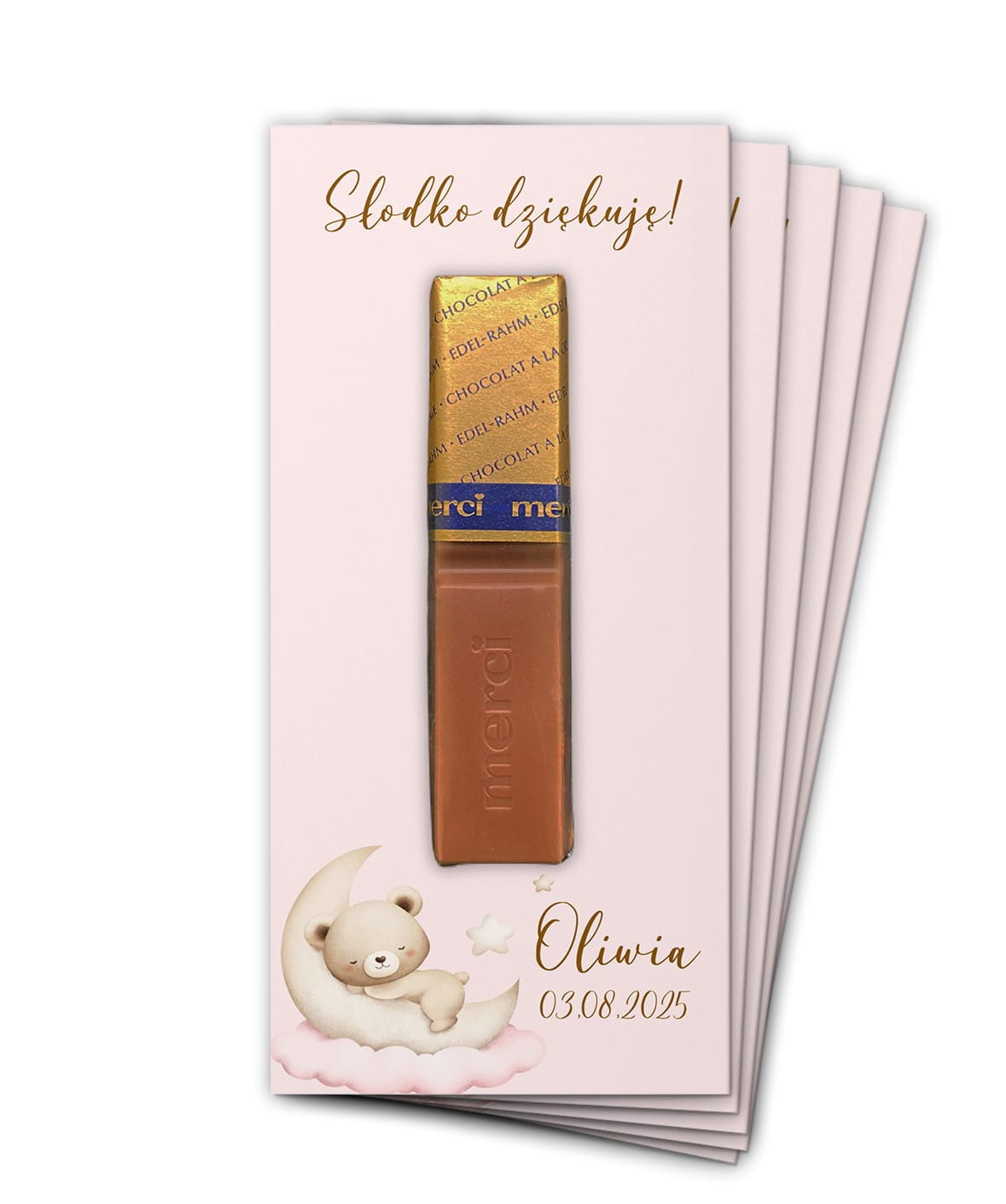 Urocze i delikatne podziękowanie z miejscem na czekoladkę Merci w pastelowym, dziecięcym stylu. Idealne na Chrzest Święty, narodziny dziecka, roczek lub baby shower.