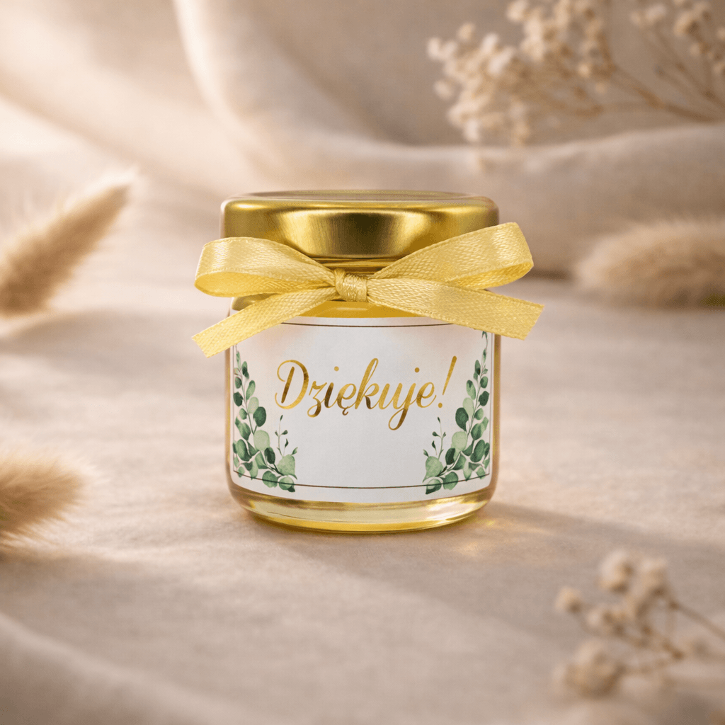 Uroczy słoiczek miodu to nie tylko słodki prezent, ale i piękna pamiątka z wyjątkowego dnia. Każdy słoiczek ozdobiony jest personalizowaną etykietą z imieniem dziecka i datą uroczystości oraz dopasowaną kolorystycznie wstążką.
