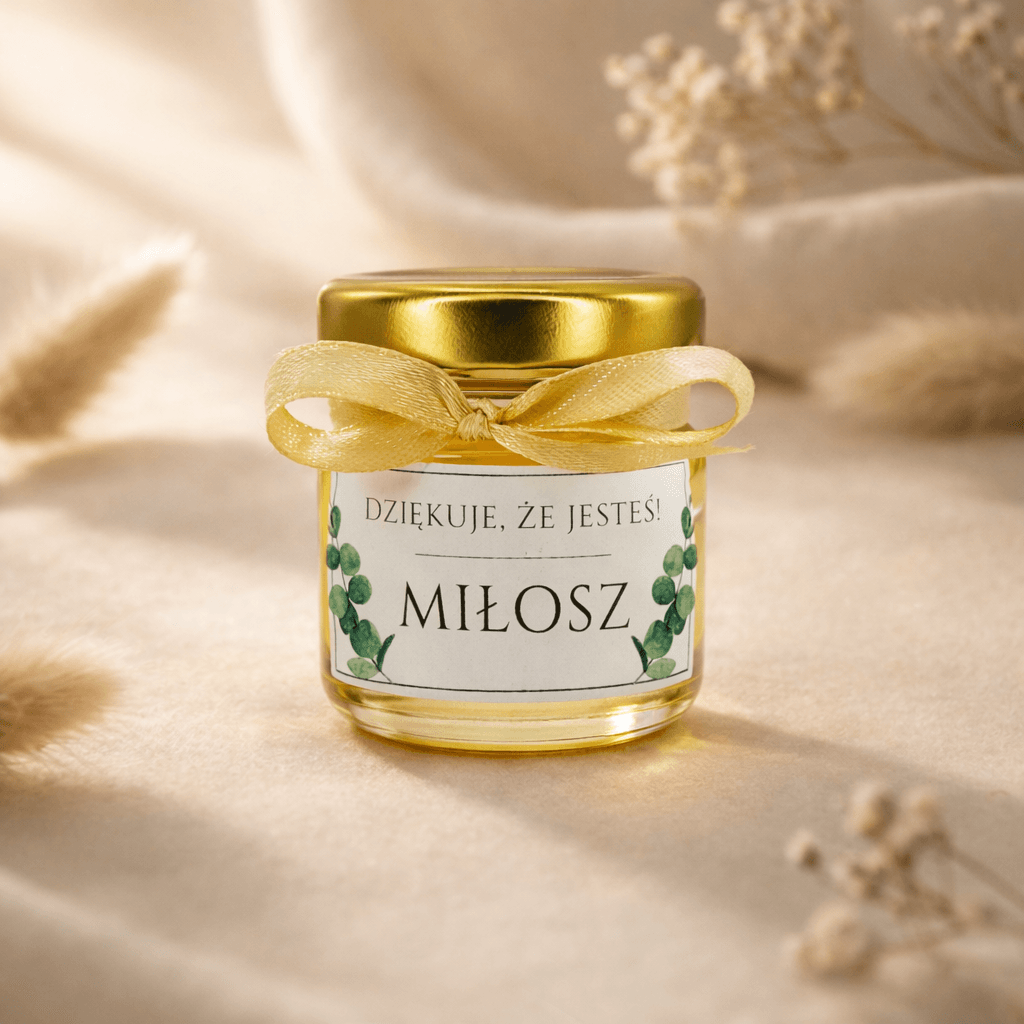 Mini miodzik z personalizowaną etykietą i dopasowaną wstążką. Słodkie podziękowanie dla gości, które zachwyca wyglądem i smakiem.