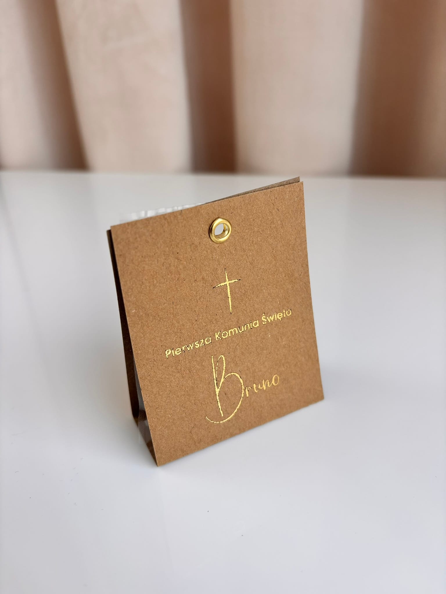 W środku znajdują się Tic Taci, dlatego produkt świetnie sprawdza się jako gotowe podziękowanie dla gości komunijnych. To drobny upominek, który łączy elegancki wygląd z miłym gestem dla zaproszonych bliskich. Złote detale pięknie kontrastują z kraftowym tłem, a oryginalna forma pudełeczka sprawia, że produkt wyróżnia się na tle klasycznych podziękowań komunijnych. Idealnie pasuje do nowoczesnych, naturalnych i rustykalnych aranżacji stołu na Pierwszą Komunię Świętą.