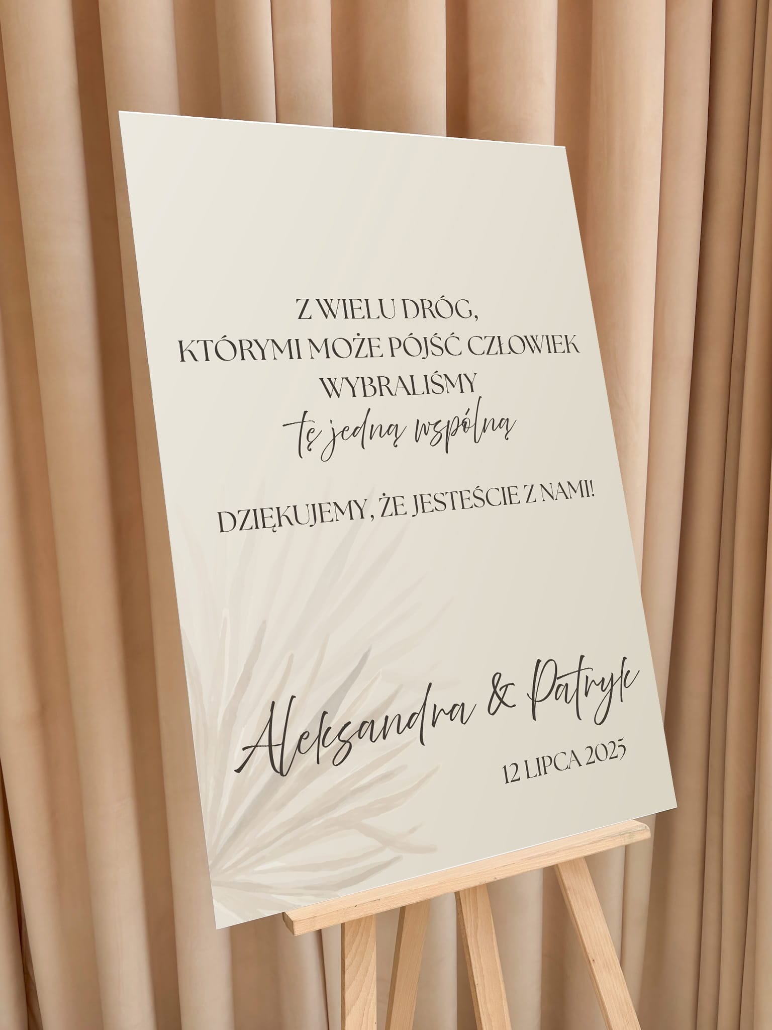 Wykonana w stylu boho – z jasnym, beżowym tłem, delikatną roślinnością i elegancką typografią – świetnie komponuje się z weselami w stylu rustykalnym, romantycznym lub klasycznym.