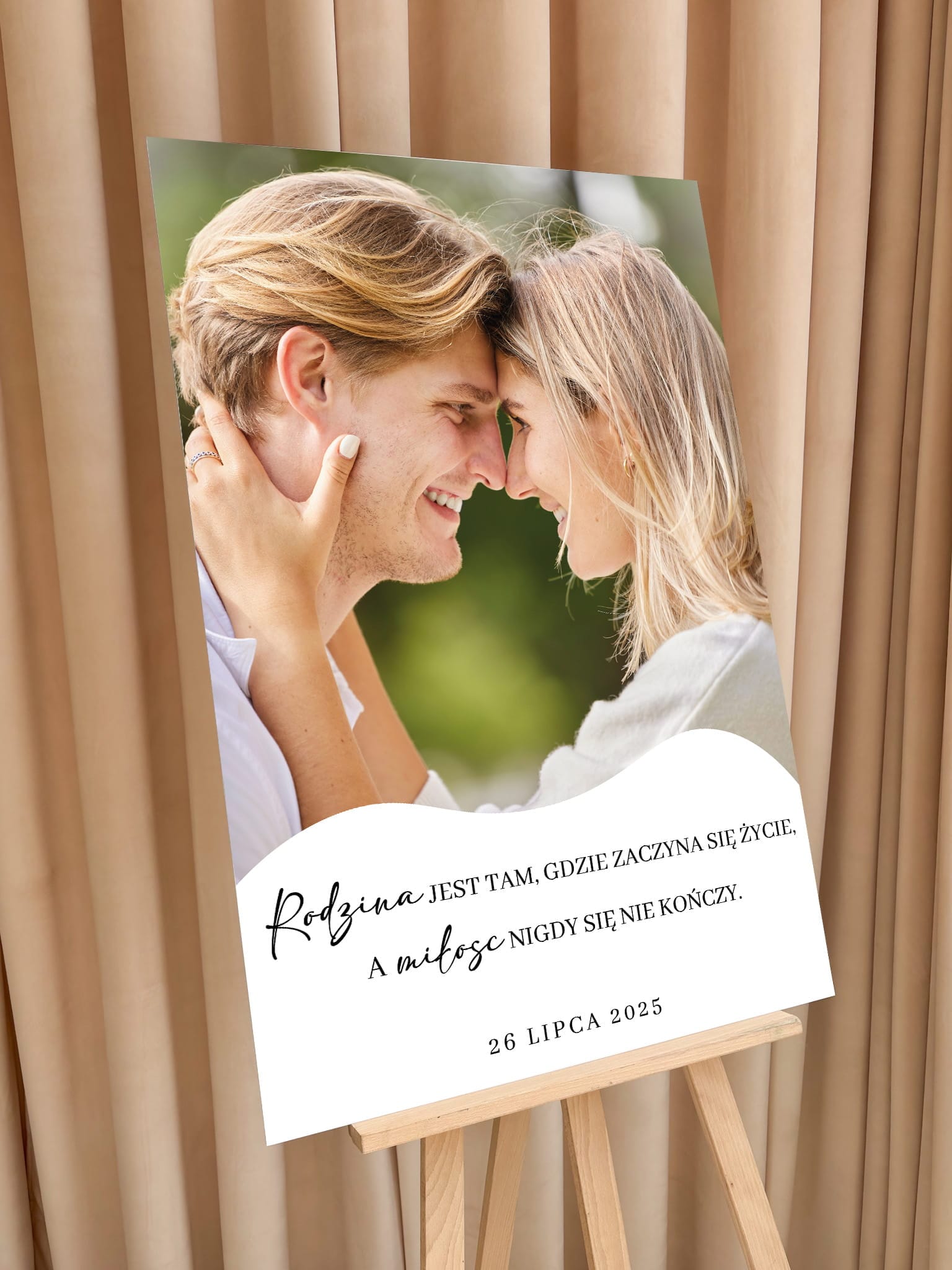 Duże zdjęcie Pary Młodej oraz klasyczny cytat o rodzinie i uczuciu nadają wyjątkowego, emocjonalnego charakteru każdemu wejściu czy sali weselnej.