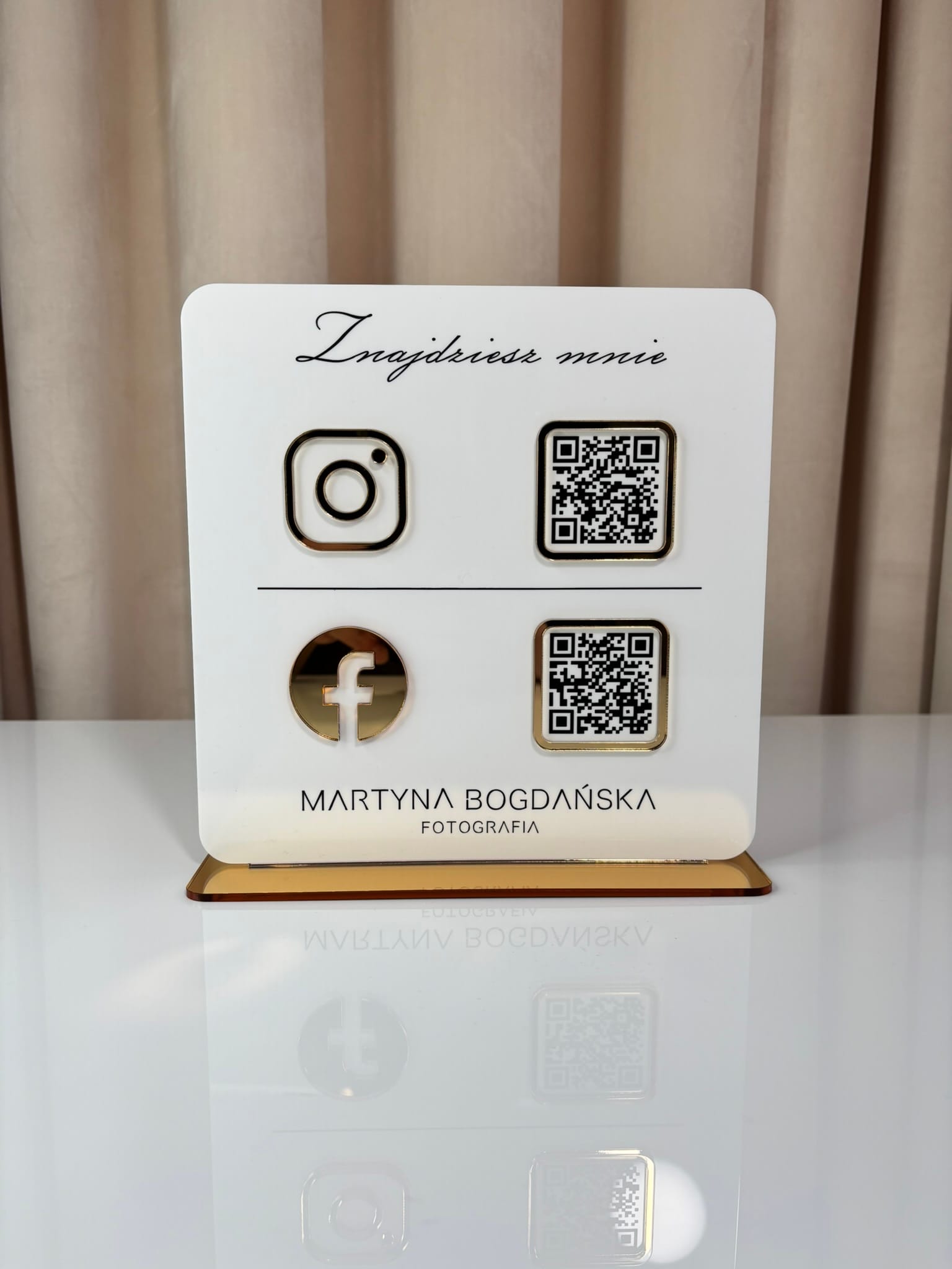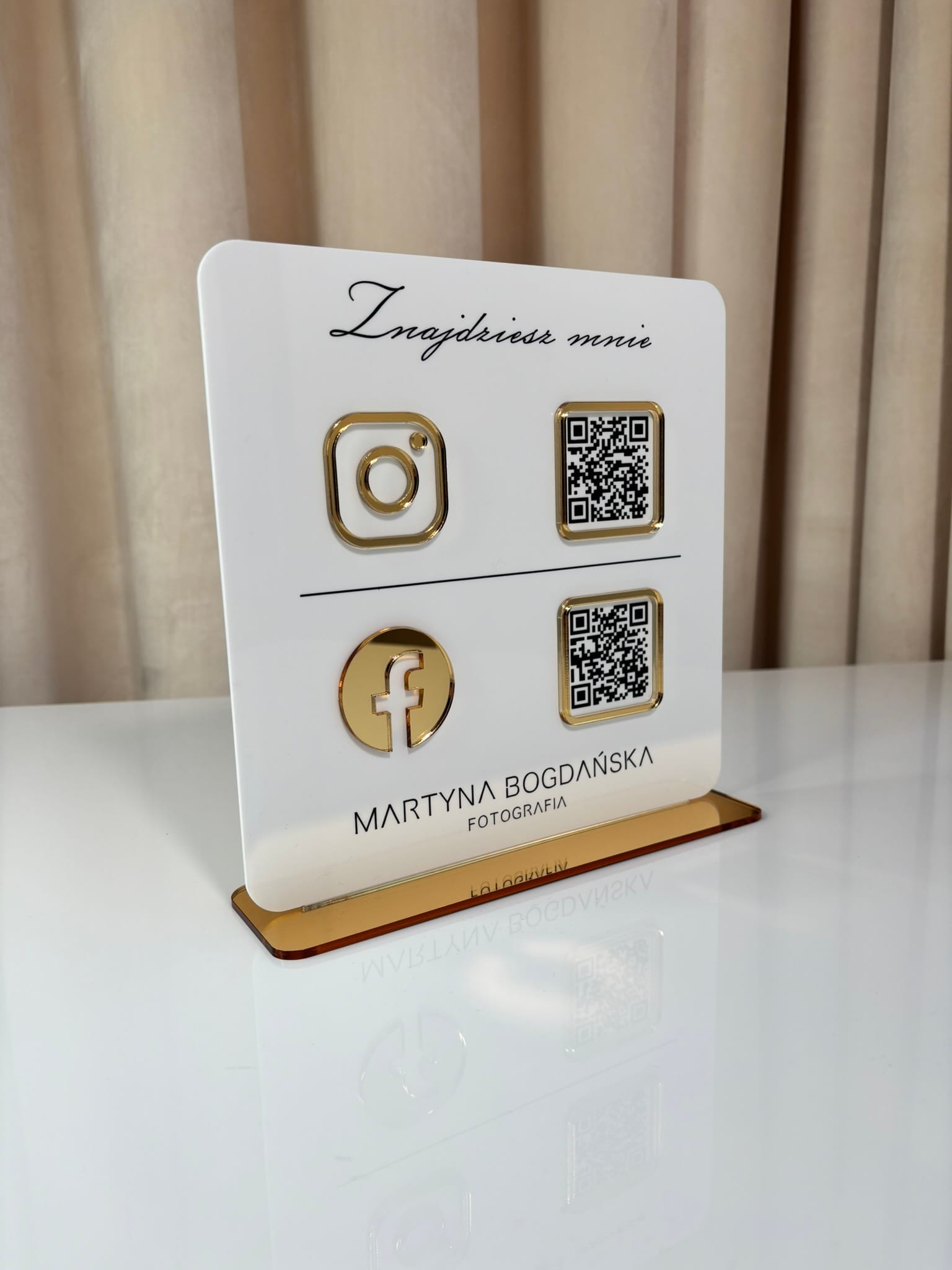 Każdy stand jest w pełni personalizowany – możesz umieścić logo firmy, nazwę, opis działalności, numer telefonu oraz kody QR prowadzące do Instagrama, Facebooka, strony internetowej lub wizytówki Google. Klient skanuje kod i od razu trafia do wybranego kanału kontaktu.