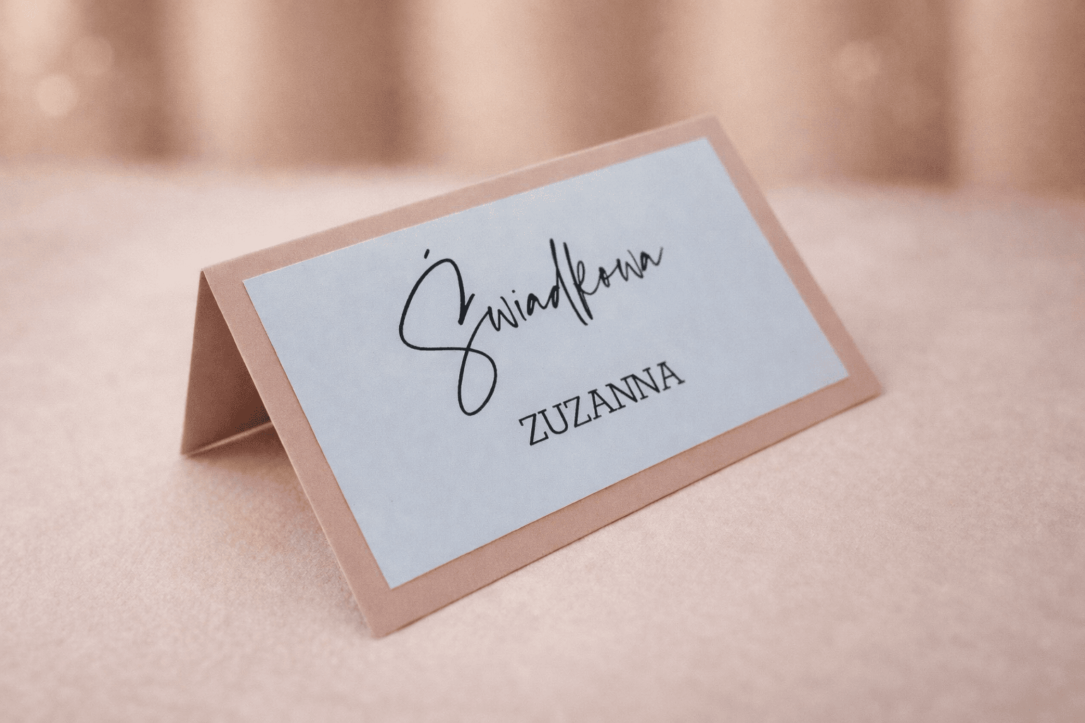 Winietka składana premium z personalizacją to elegancki dodatek na stół, który łączy funkcję praktyczną z dekoracyjną. Została wykonana z ozdobnej, sztywnej bazy w delikatnym odcieniu pudrowego różu oraz uzupełniona naklejaną kartą frontową z nadrukowanym imieniem i nazwiskiem gościa. Dzięki takiemu połączeniu całość wygląda bardzo estetycznie, lekko i nowocześnie.
