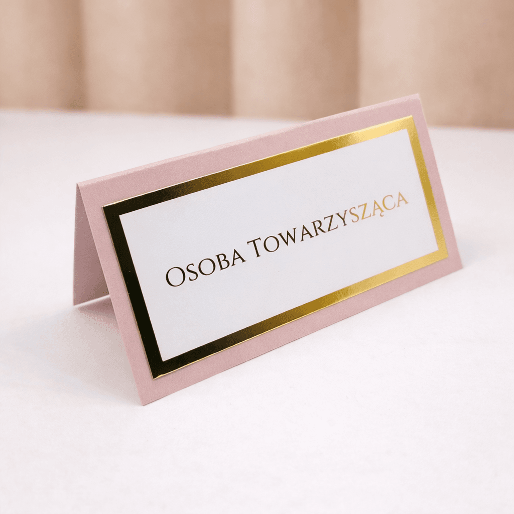Winietka premium wykonana z ozdobnej różowej bazy, białego frontu oraz złotej ramki z papieru lustrzanego. Dodatkowe złocenie napisu nadaje całości bardziej elegancki i luksusowy charakter. Świetnie sprawdza się jako estetyczne oznaczenie miejsca przy stole i dobrze pasuje do dekoracji w stylu klasycznym, nowoczesnym i glamour.