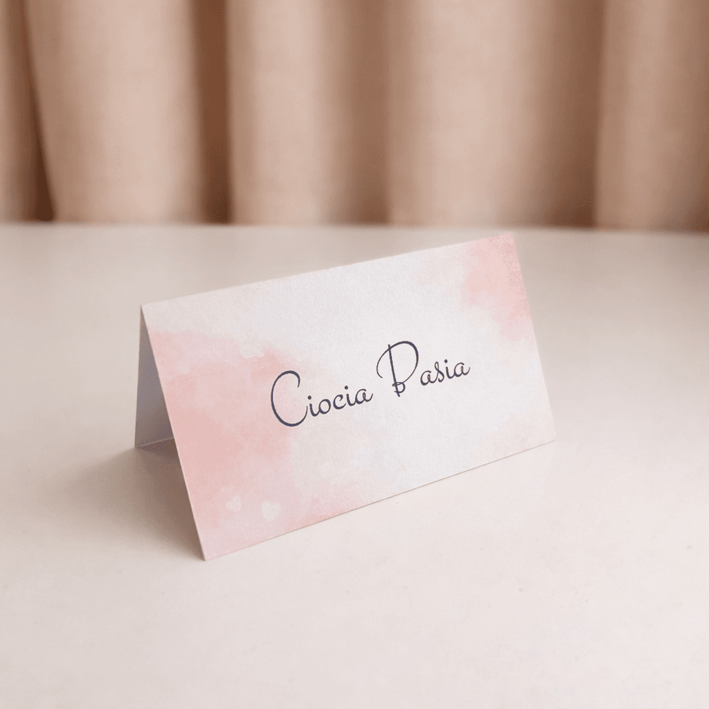Składana winietka z jasnym, akwarelowym motywem w odcieniach różu i personalizowanym imieniem gościa. Prosty, miękki projekt sprawia, że pasuje do lekkich, romantycznych i dziewczęcych aranżacji stołu. Dobrze prezentuje się jako samodzielny dodatek albo w komplecie z pozostałą papeterią w tym samym stylu.