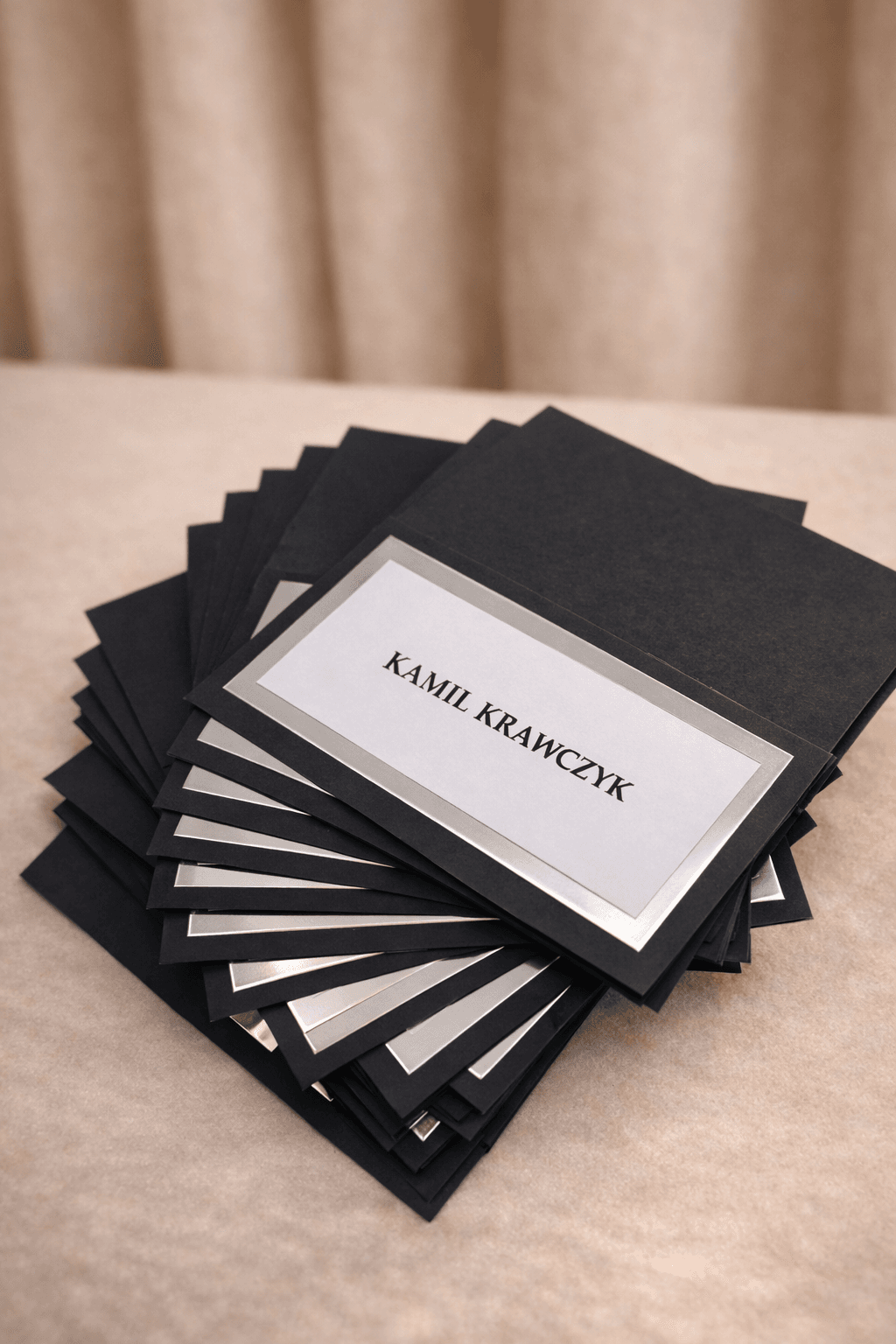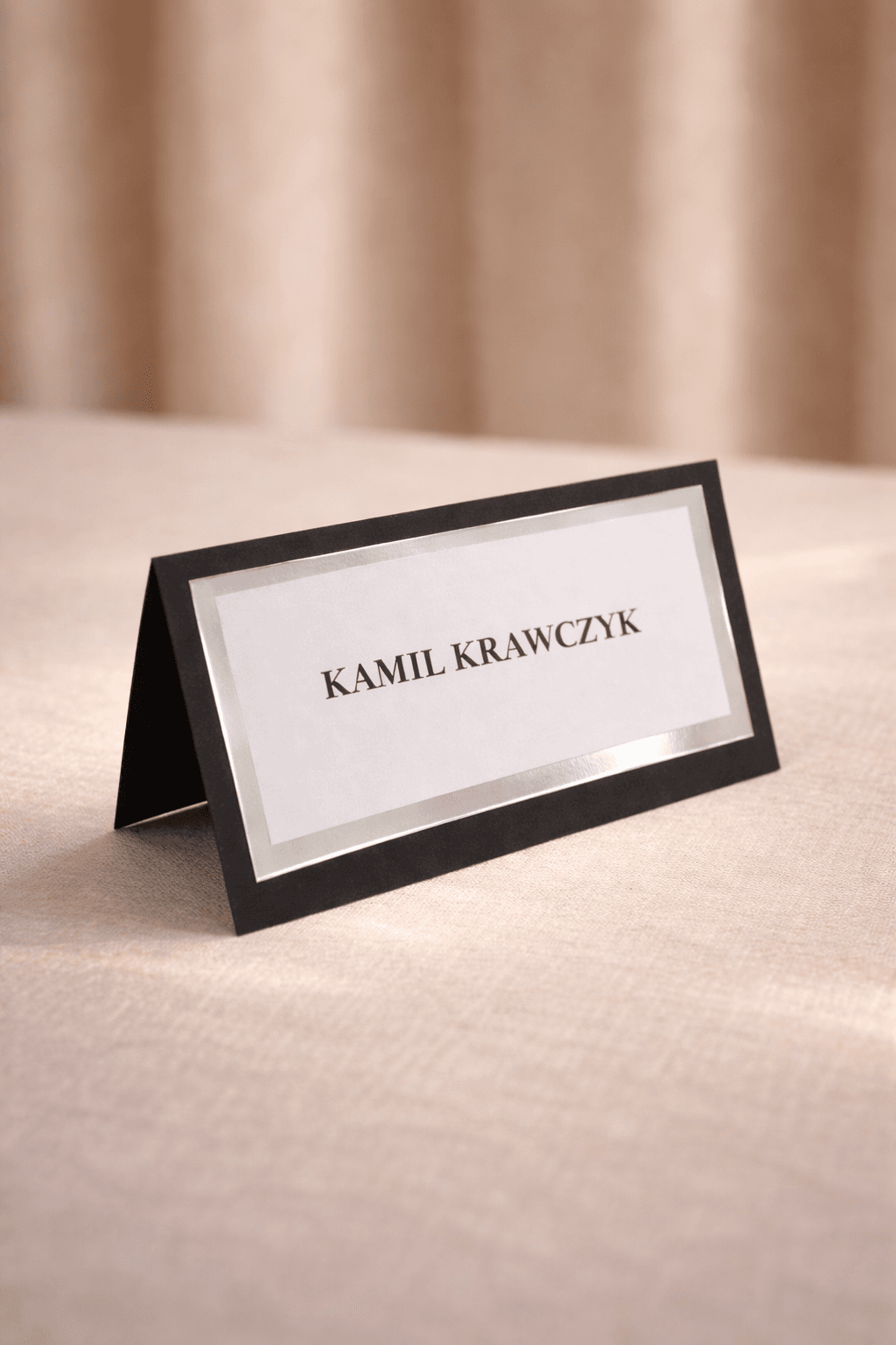 Składana winietka premium wykonana z czarnej bazy, białego frontu oraz srebrnej ramki z papieru lustrzanego. Kontrastowe połączenie czerni, bieli i srebra daje bardzo elegancki, nowoczesny efekt i dobrze sprawdza się na przyjęciach w stylu klasycznym, glamour i modern. Personalizowany nadruk sprawia, że winietka jest jednocześnie praktycznym i dekoracyjnym dodatkiem na stół.
