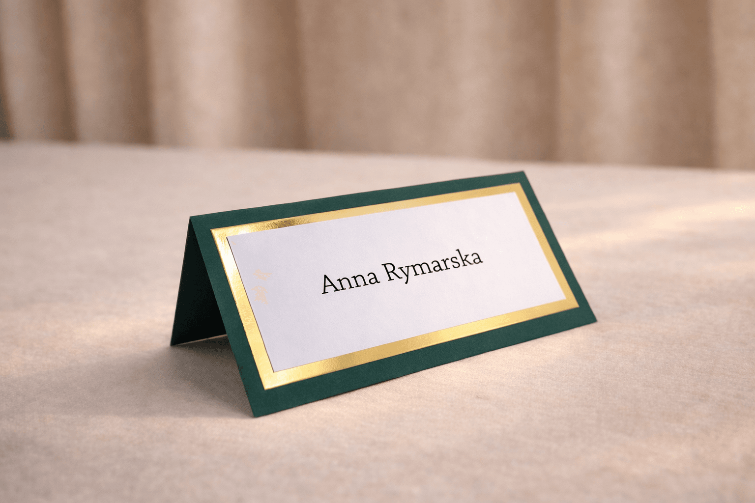 Elegancka winietka składana z ciemnozieloną bazą, złotą ramką i personalizowanym nadrukiem. Klasyczne, wyraziste połączenie kolorów, które świetnie wygląda na eleganckim stole.