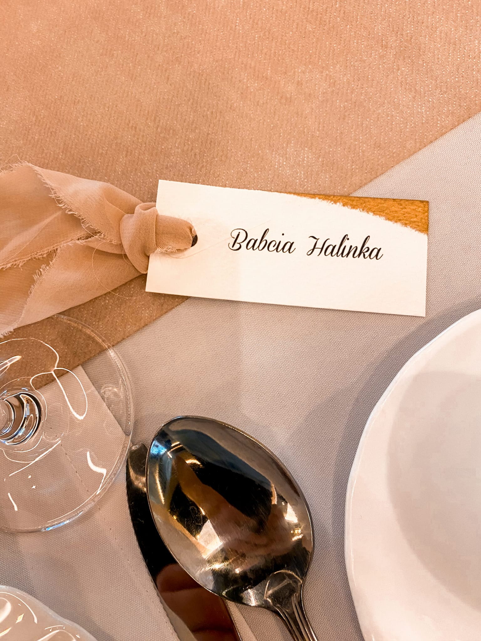 Personalizowana winietka na stół to elegancki dodatek, który łączy funkcję praktyczną z estetycznym wykończeniem aranżacji. Model wykonany z jasnego papieru ozdobnego z subtelnym nadrukiem imienia i nazwiska gościa doskonale wpisuje się w klasyczne, nowoczesne i romantyczne dekoracje stołu. Dzięki prostej, minimalistycznej formie winietka prezentuje się lekko i stylowo, a jednocześnie ułatwia organizację miejsc dla gości.