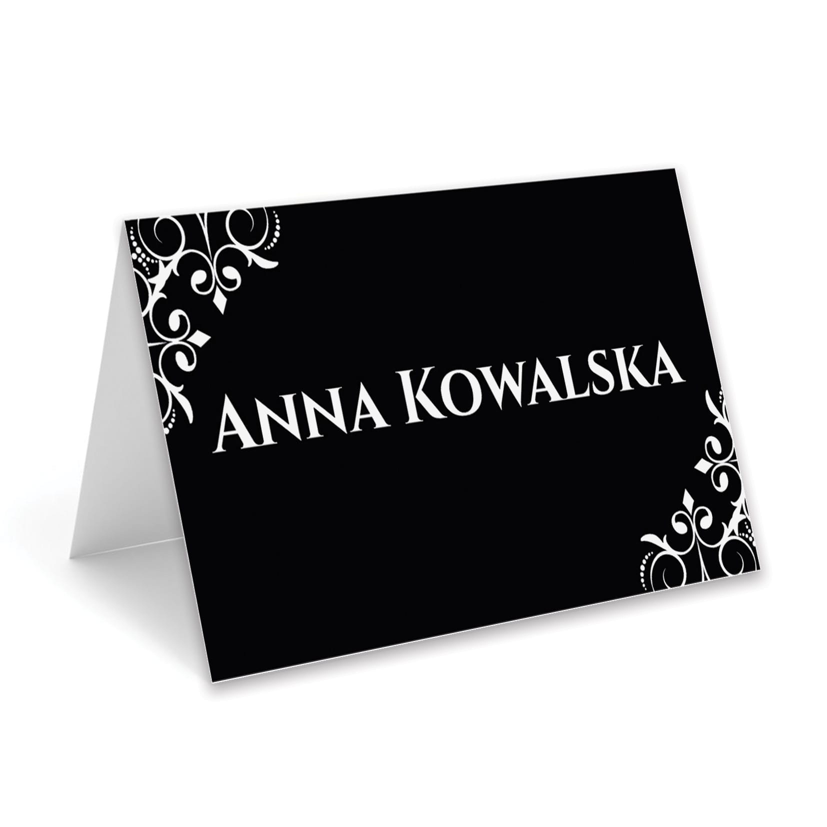 Imię i nazwisko nadrukowane wyraźną czcionką gwarantują doskonałą czytelność, a kontrastowe połączenie czerni i bieli dodaje całości szyku i klasy.