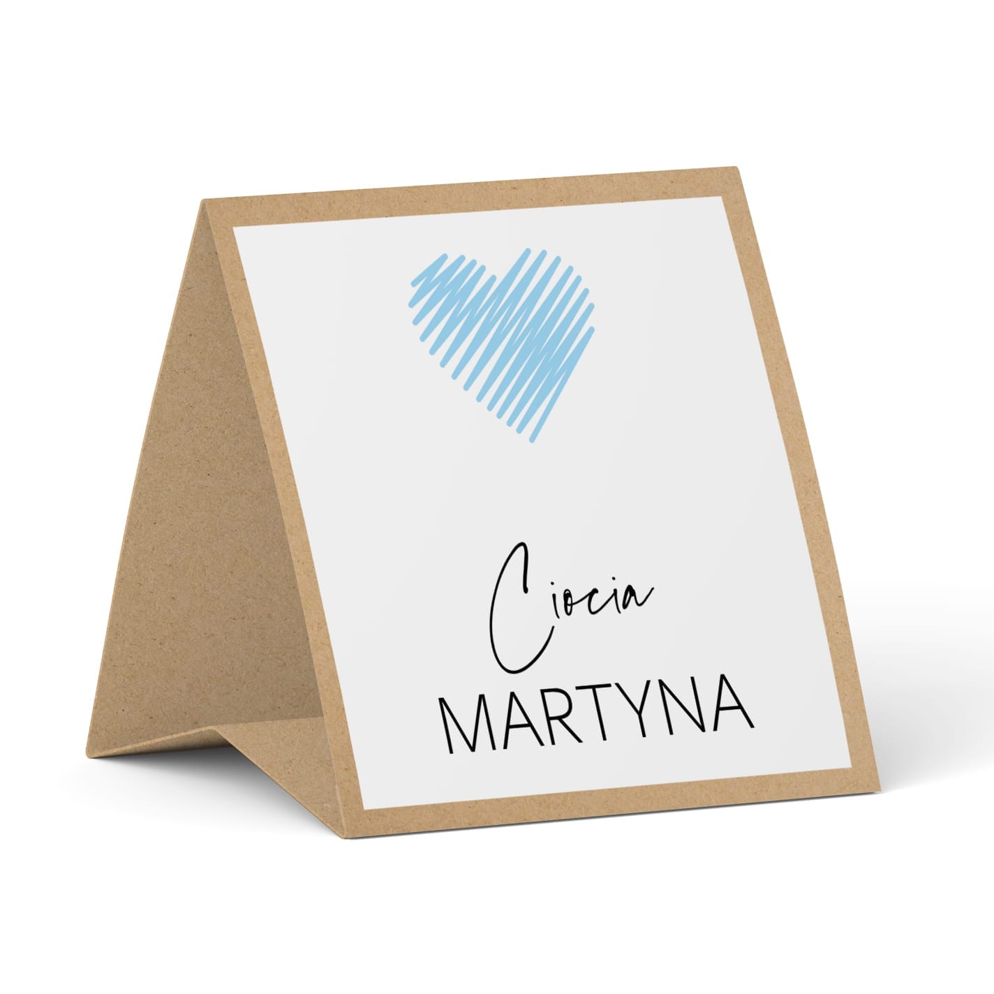 Urocza winietka utrzymana w naturalnym, kraftowym stylu z błękitnym sercem – idealna na przyjęcie z okazji chrztu, roczku lub urodzin chłopca.