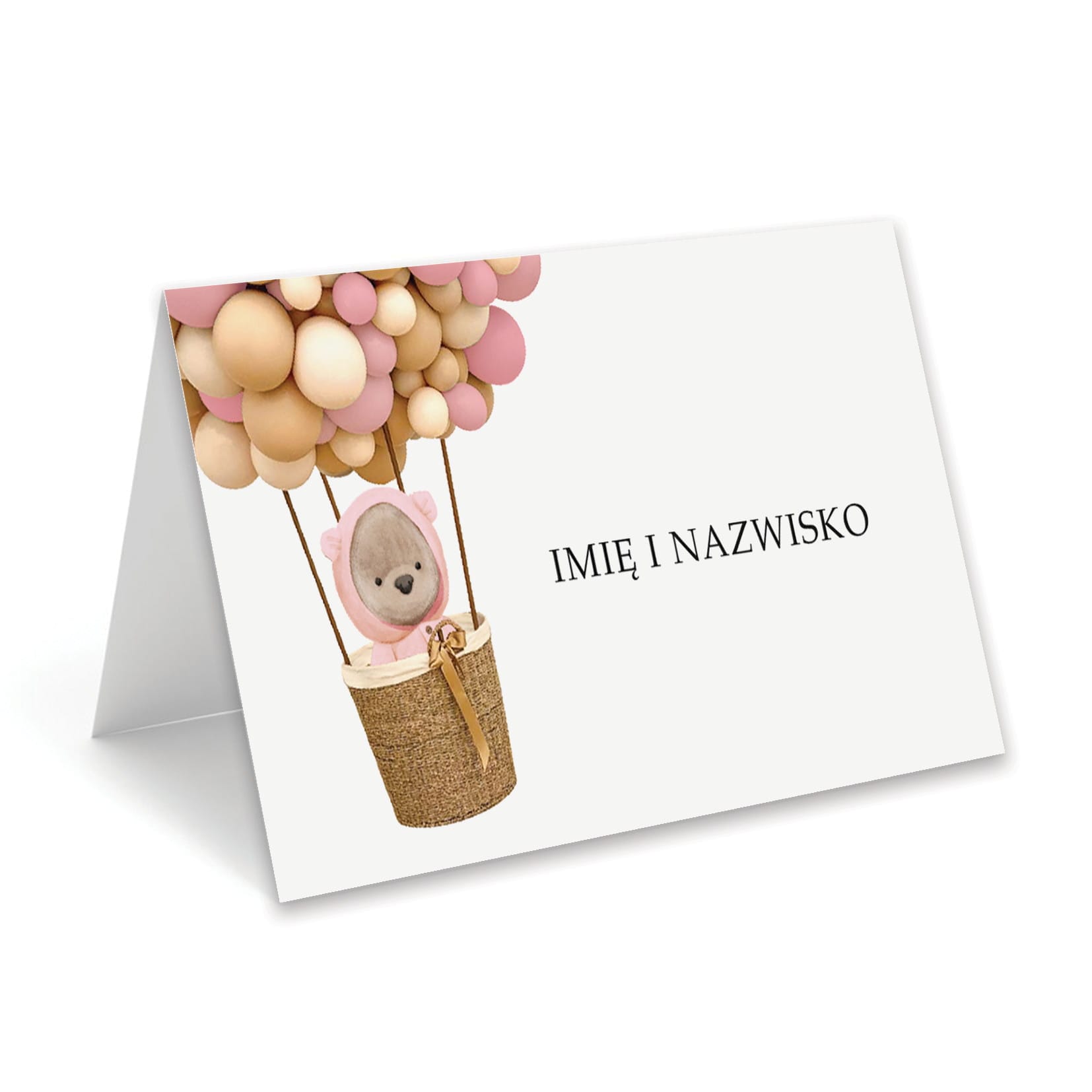 Urocza winietka z motywem misia lecącego w balonach w odcieniach różu i beżu to idealny dodatek na przyjęcie z okazji chrztu, roczku lub urodzin dziewczynki.