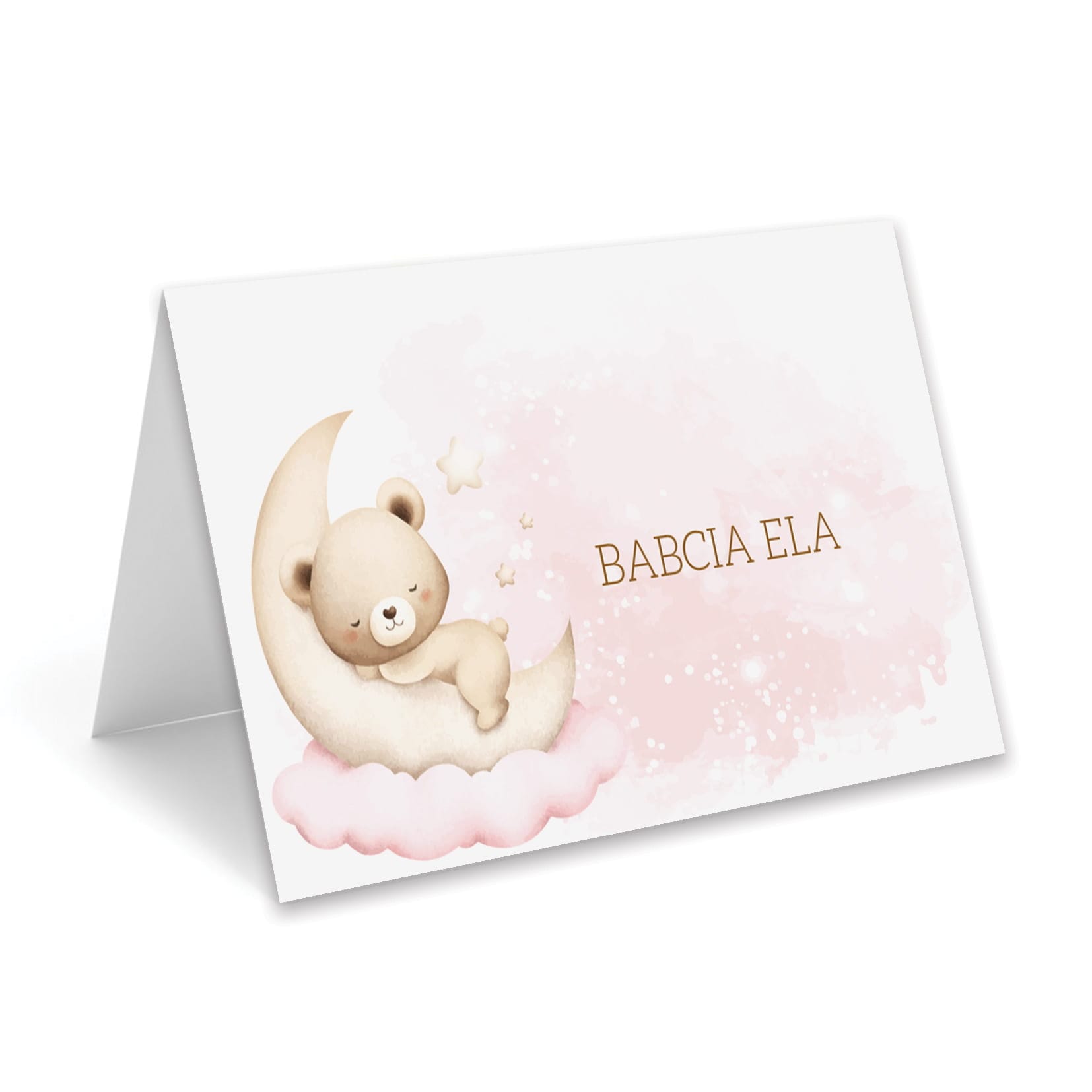 Urocza winietka na stół z misiem na chmurce to idealny dodatek do przyjęcia z okazji chrztu, roczku, baby shower lub przyjęcia z okazji narodzin dziewczynki. Delikatny pastelowy róż w połączeniu z akwarelowym motywem misia tworzy subtelną, dziecięcą kompozycję, która wprowadzi ciepły i magiczny klimat na Twoim stole.
