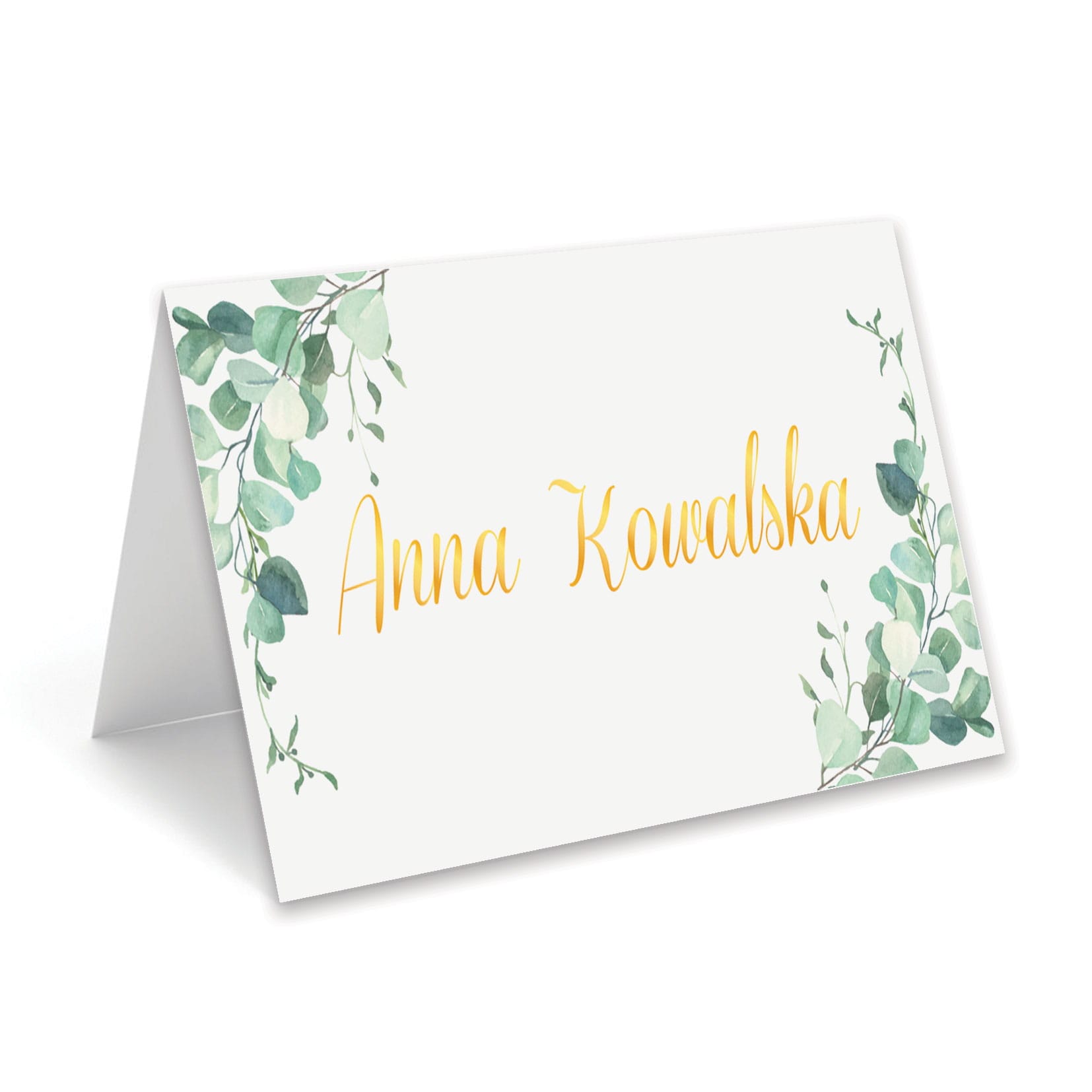 Stylowa winietka na stół z motywem eukaliptusa i złotym napisem to doskonały sposób, aby dodać uroku i elegancji każdemu przyjęciu. Subtelne akwarelowe gałązki w odcieniach zieleni w połączeniu ze złotą czcionką tworzą harmonijną i naturalną kompozycję, idealną na wesele, komunię, chrzest lub uroczysty obiad rodzinny.