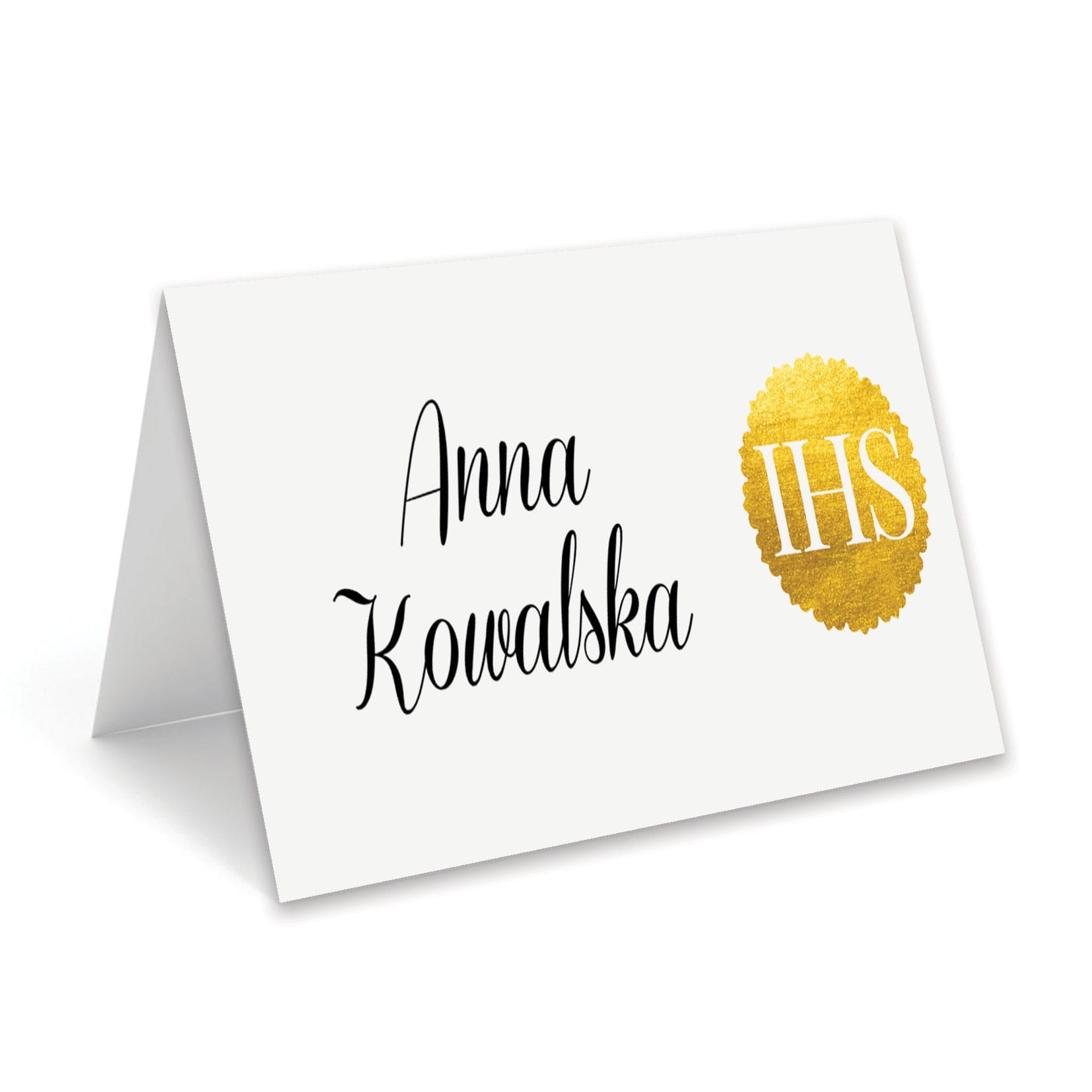 Minimalistyczna i elegancka winietka na stół z motywem IHS w złotym kolorze to doskonały dodatek do uroczystości religijnych takich jak Pierwsza Komunia Święta, Chrzest Święty czy Bierzmowanie.