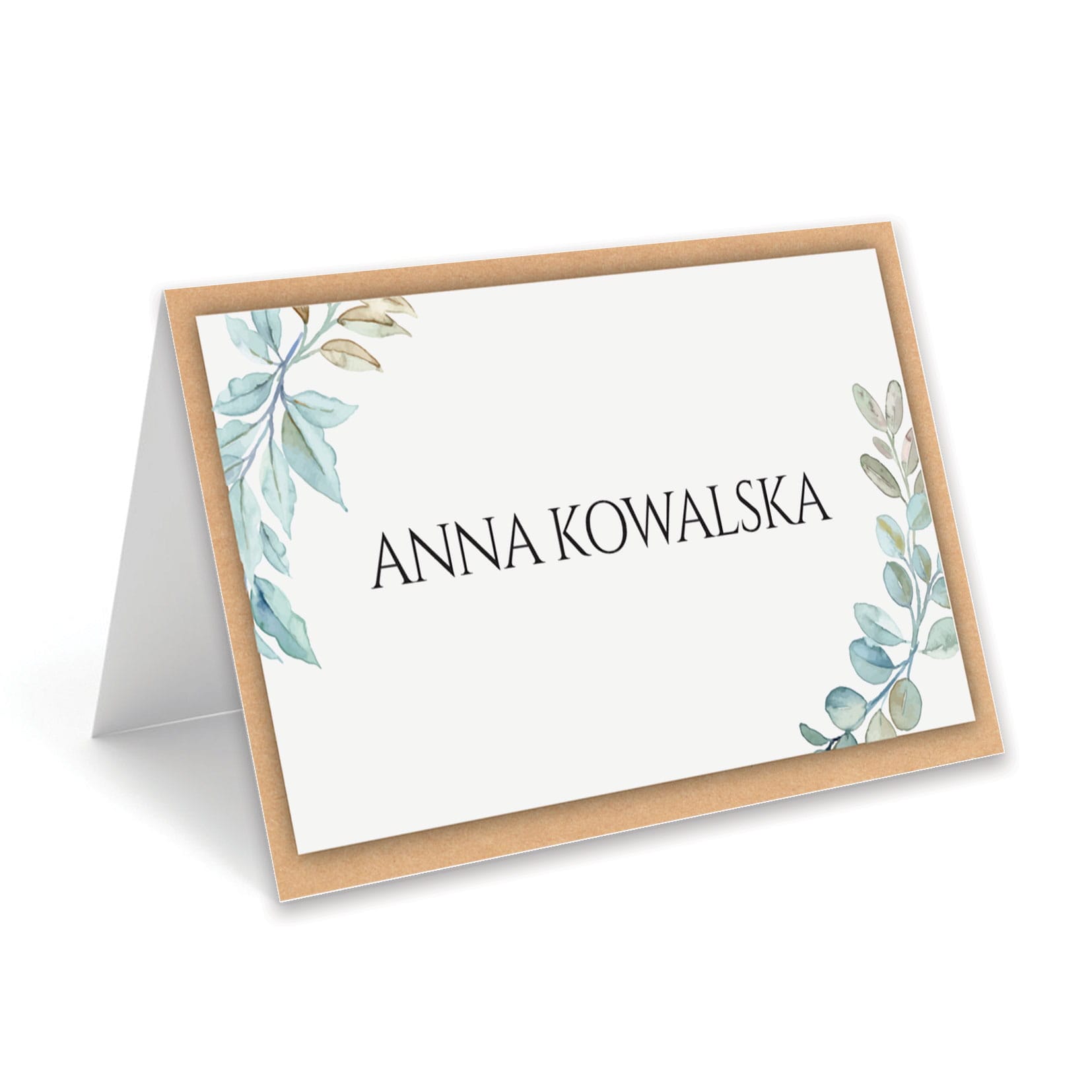 Delikatne akwarelowe gałązki w odcieniach zieleni zestawione z ciepłym brązem ramki tworzą elegancką, a zarazem naturalną kompozycję.