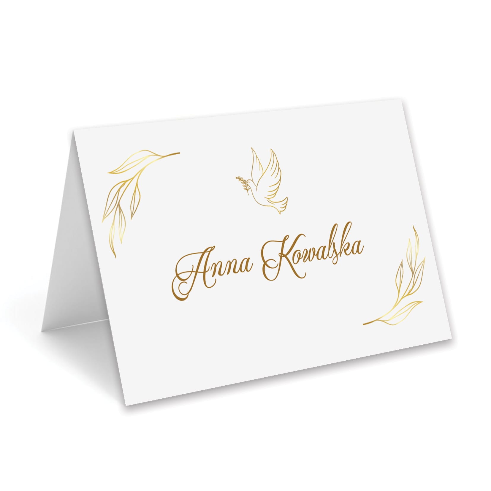 Złote detale nadają winietce szlachetności i klasy, a personalizowany nadruk imienia gościa (np. Anna Kowalska) pozwala stworzyć spójną i elegancką aranżację stołu.