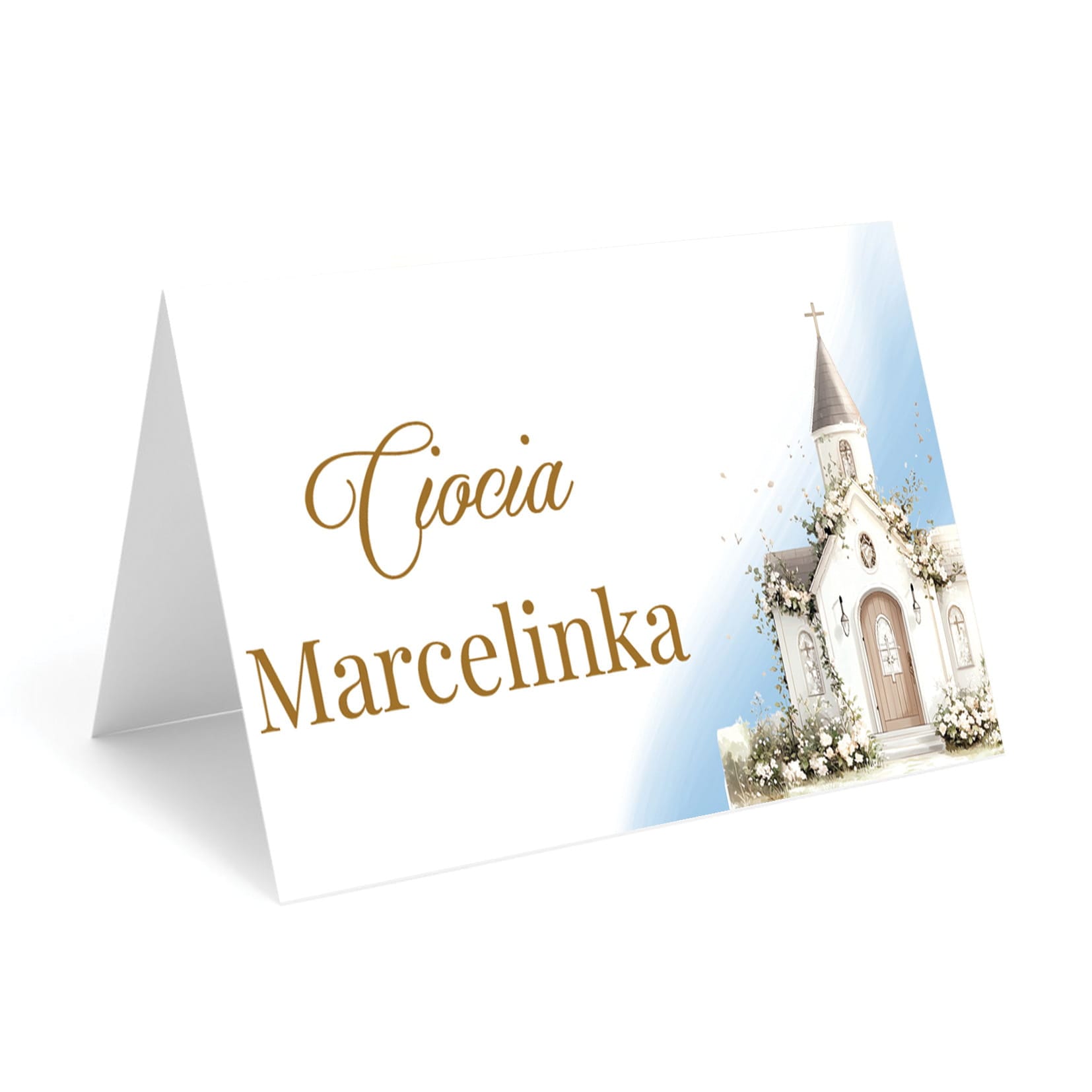 Subtelna winietka komunijna z motywem kościółka w pastelowych barwach to wyjątkowy dodatek do aranżacji stołu podczas Pierwszej Komunii Świętej. Delikatna grafika i złoty napis tworzą elegancką kompozycję, która wprowadza uroczysty, a zarazem ciepły klimat.