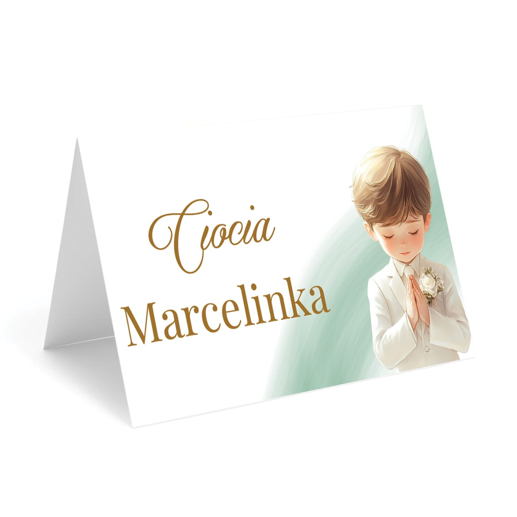 Subtelna i elegancka winietka komunijna z ilustracją modlącego się chłopca w białym garniturze to wyjątkowa ozdoba stołu podczas Pierwszej Komunii Świętej. Delikatne, zielonkawe tło oraz złoty napis nadają całości lekkości i uroczystego charakteru.