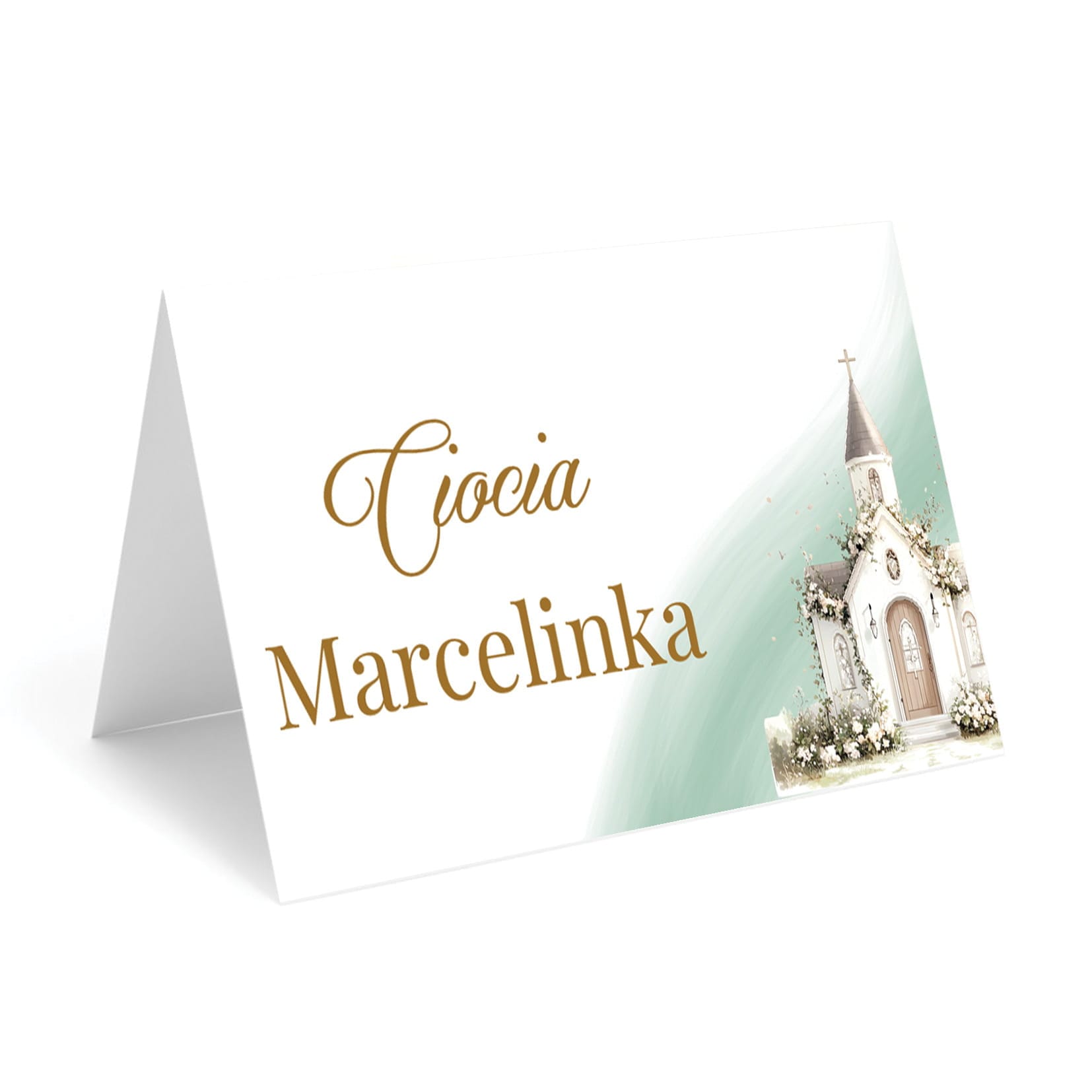 Subtelna i pełna uroku winietka komunijna z motywem kościółka to idealny dodatek do aranżacji stołu podczas Pierwszej Komunii Świętej. Delikatna grafika świątyni w otoczeniu kwiatów oraz miękkie, zielonkawe tło tworzą wyjątkowo elegancki i spokojny klimat.