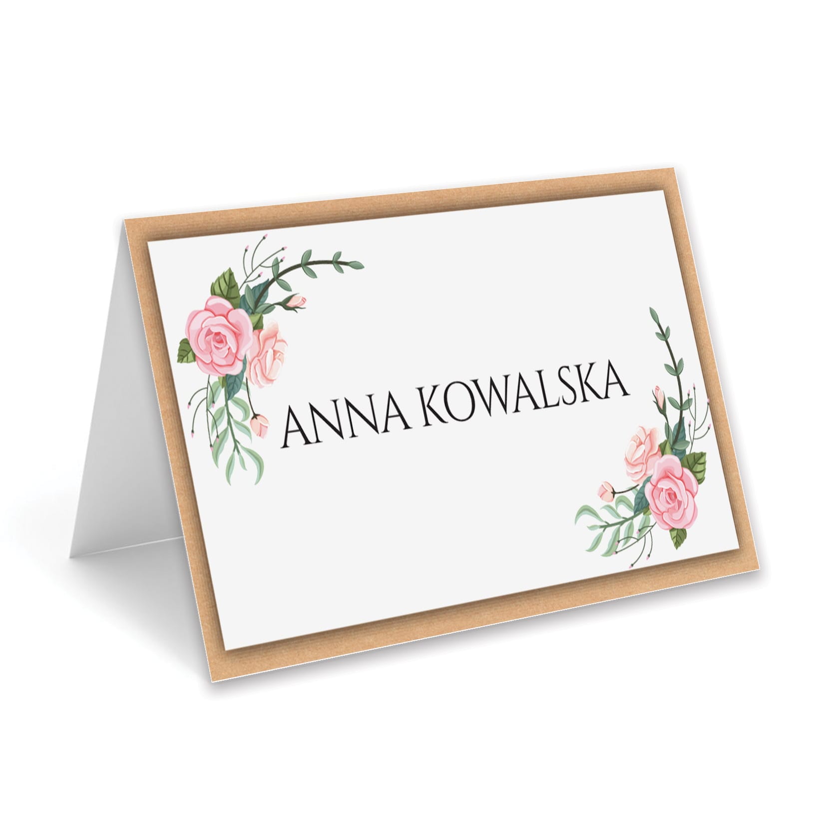 Stylowa winietka ślubna z kwiatowym motywem to idealny sposób, by w elegancki sposób oznaczyć miejsca gości podczas przyjęcia. Delikatne różowe róże i zielone gałązki pięknie komponują się z kraftową ramką, nadając winietce naturalnego, rustykalnego charakteru.