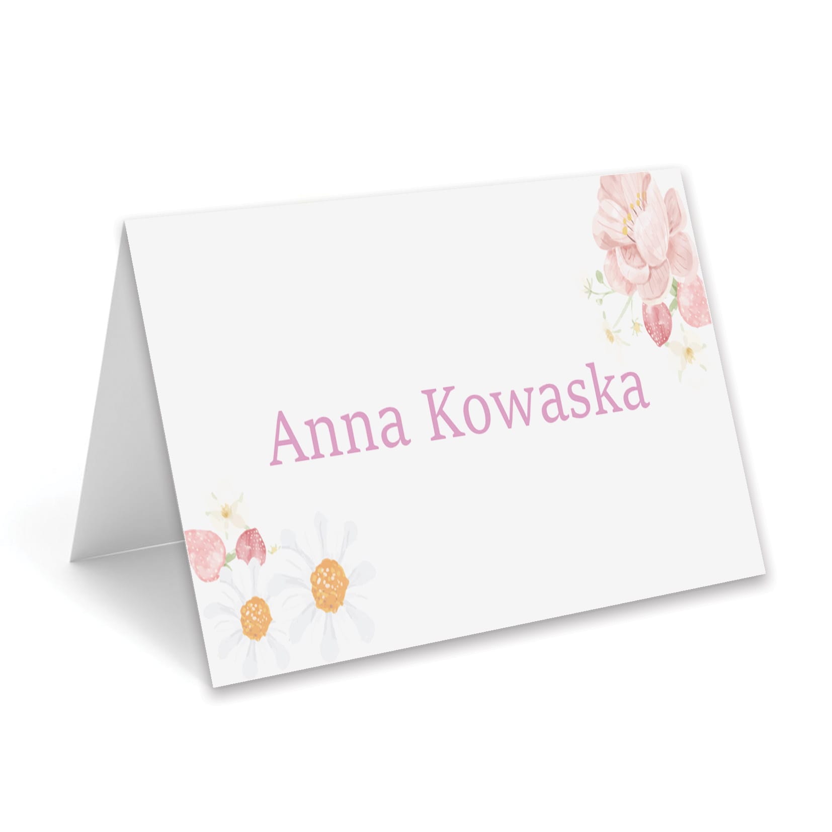 Zastosowana delikatna typografia w odcieniu różu podkreśla lekkość projektu, a możliwość personalizacji imienia i nazwiska gościa sprawia, że każda winietka nabiera indywidualnego charakteru.