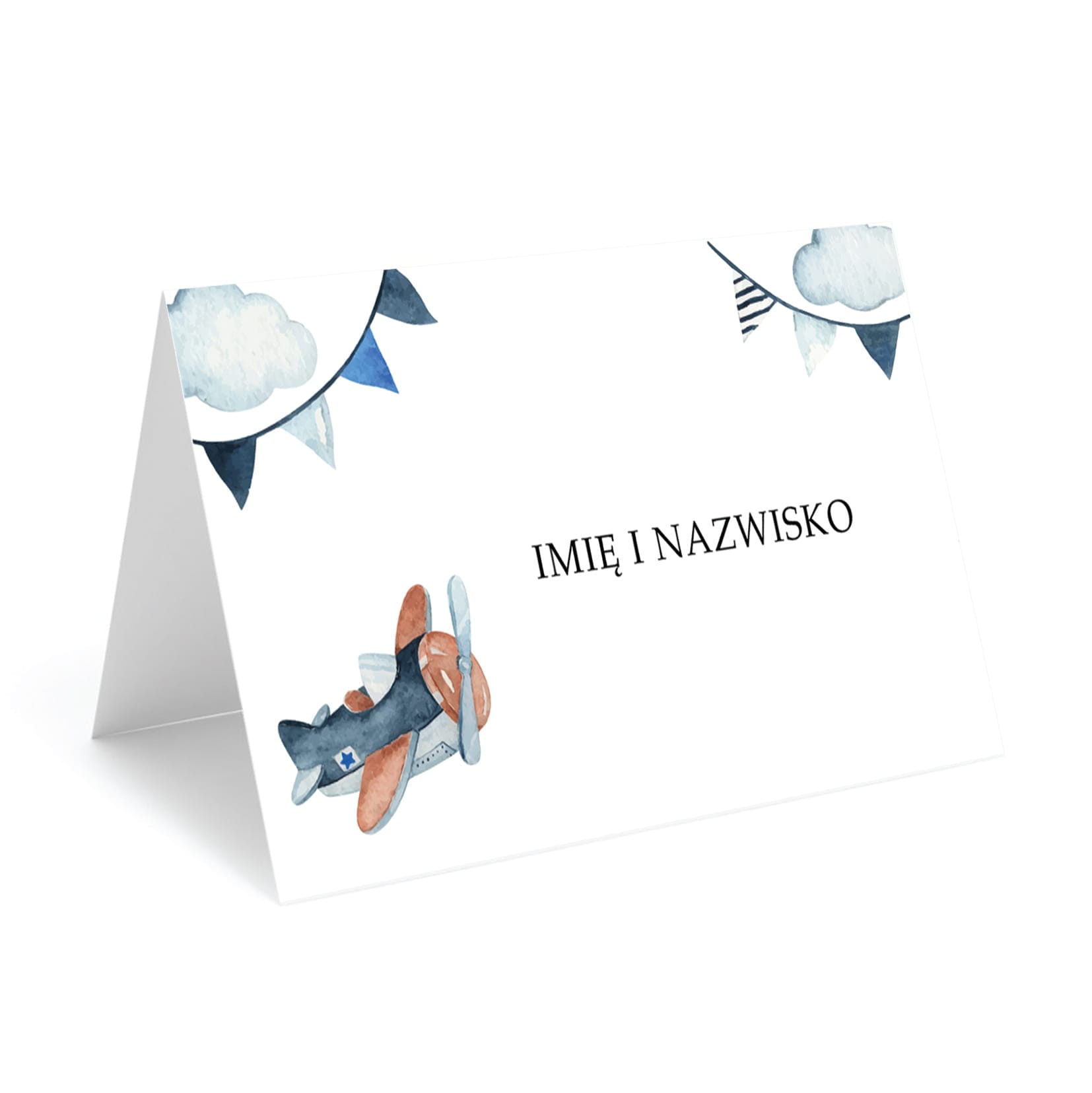 Winietka z motywem samolotu w stylu akwareli. Idealna na chrzest, roczek lub komunię chłopca. Urocza, personalizowana dekoracja stołu.