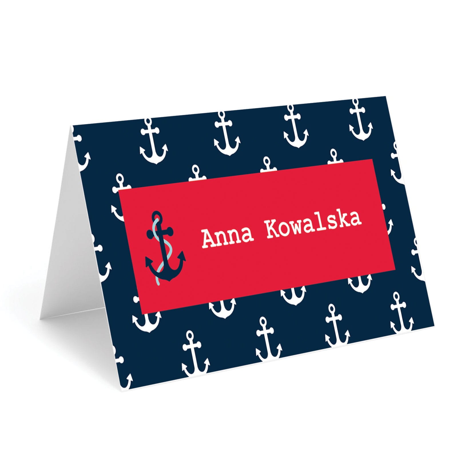Granatowe tło z białymi kotwicami i czerwony akcent nadają całości wyjątkowego, eleganckiego charakteru. Winietka doskonale sprawdzi się zarówno na uroczystości dla chłopca, jak i podczas letnich przyjęć w stylu żeglarskim.