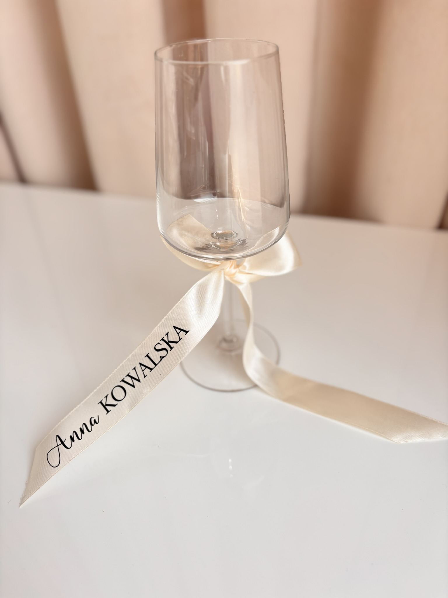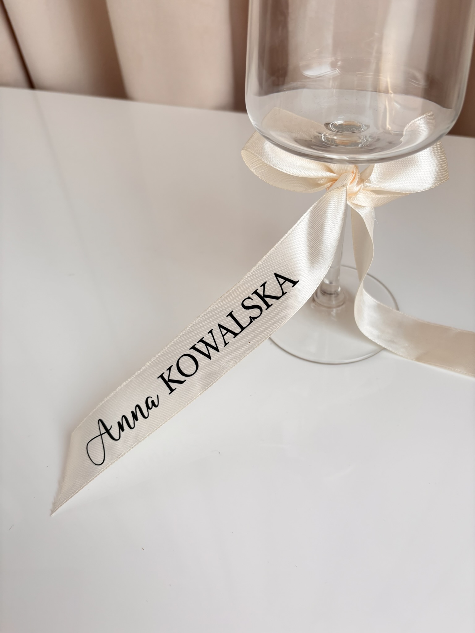 Każda wstążka zawiera personalizowany nadruk, co pozwala gościom szybko znaleźć swoje miejsce. Jednocześnie kieliszki wyglądają elegancko i spójnie, szczególnie jeśli kolor wstążki dopasujesz do całej aranżacji.