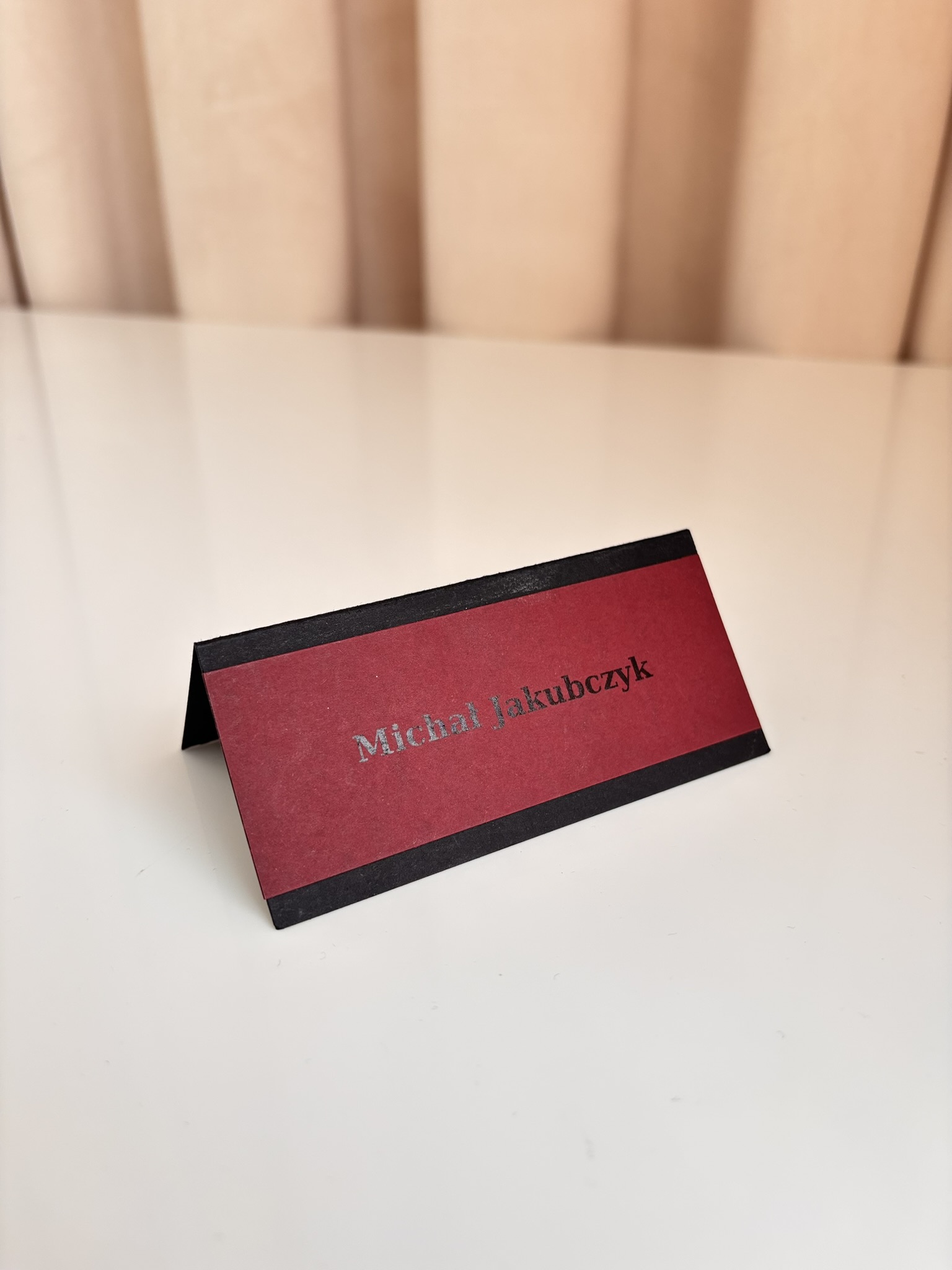 Winietki personalizowane eleganckie w czerwono-czarnym wydaniu to propozycja dla osób, które chcą czegoś bardziej wyrazistego niż klasyczna biel. Mocny kolor w połączeniu z czernią tworzy efekt premium i od razu przyciąga uwagę na stole.