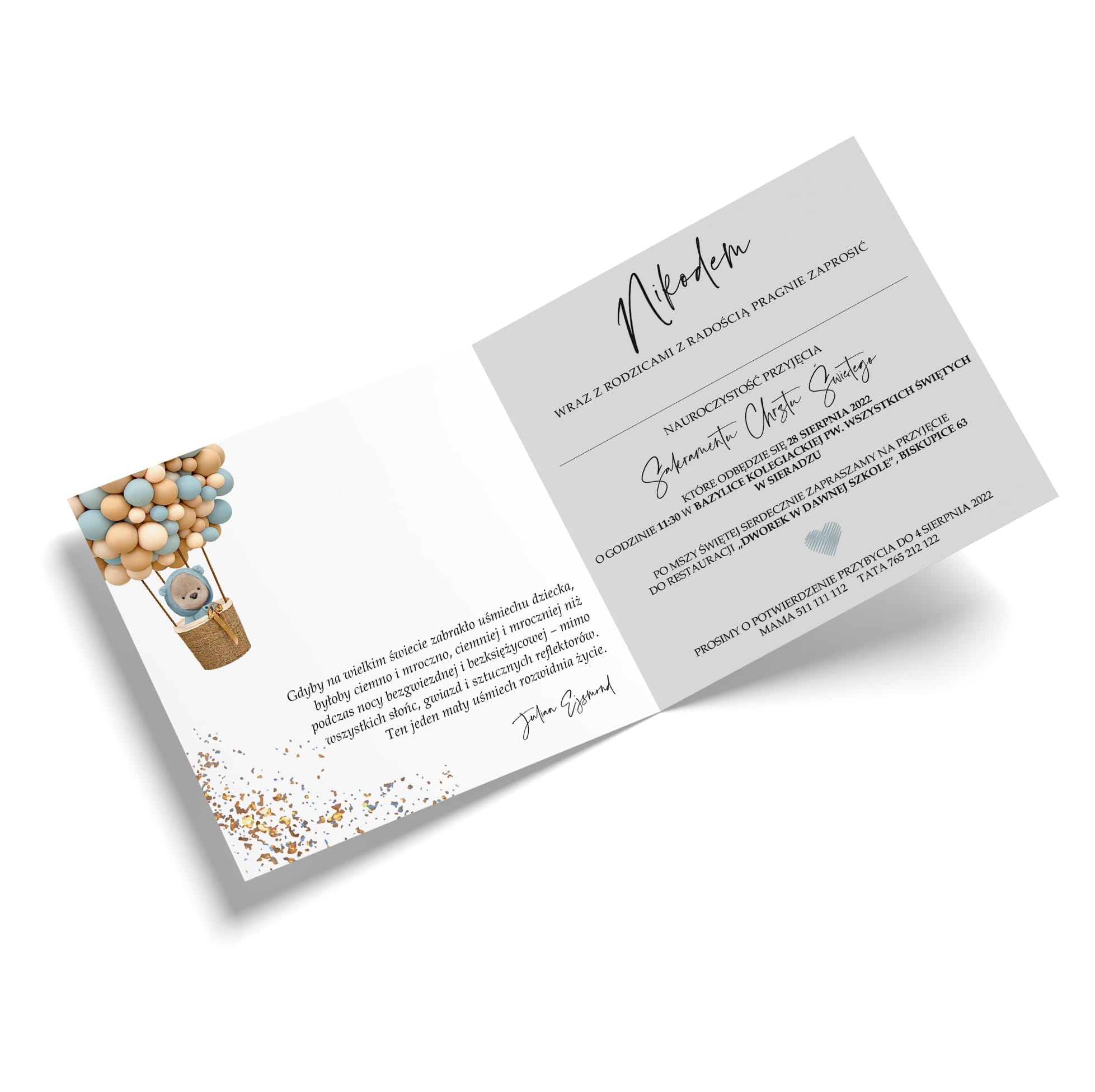 Zaproszenie na Chrzest Święty w nowoczesnym stylu, ozdobione motywem uroczego misia w balonie w pastelowych odcieniach błękitu i beżu. Projekt uzupełniają delikatne złote akcenty, które nadają całości eleganckiego charakteru. Wnętrze zaproszenia zostało zaprojektowane w przejrzysty i harmonijny sposób, zawierając miejsce na personalizowany tekst i inspirujący cytat.