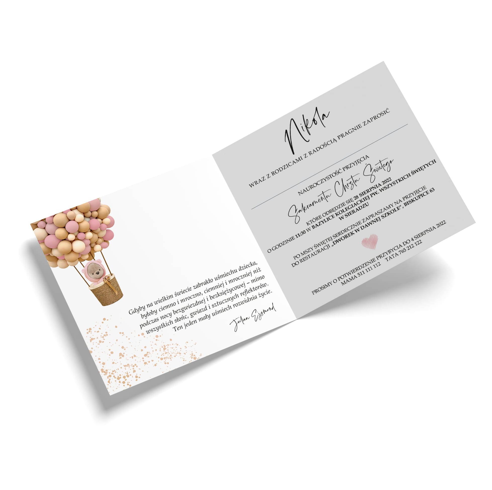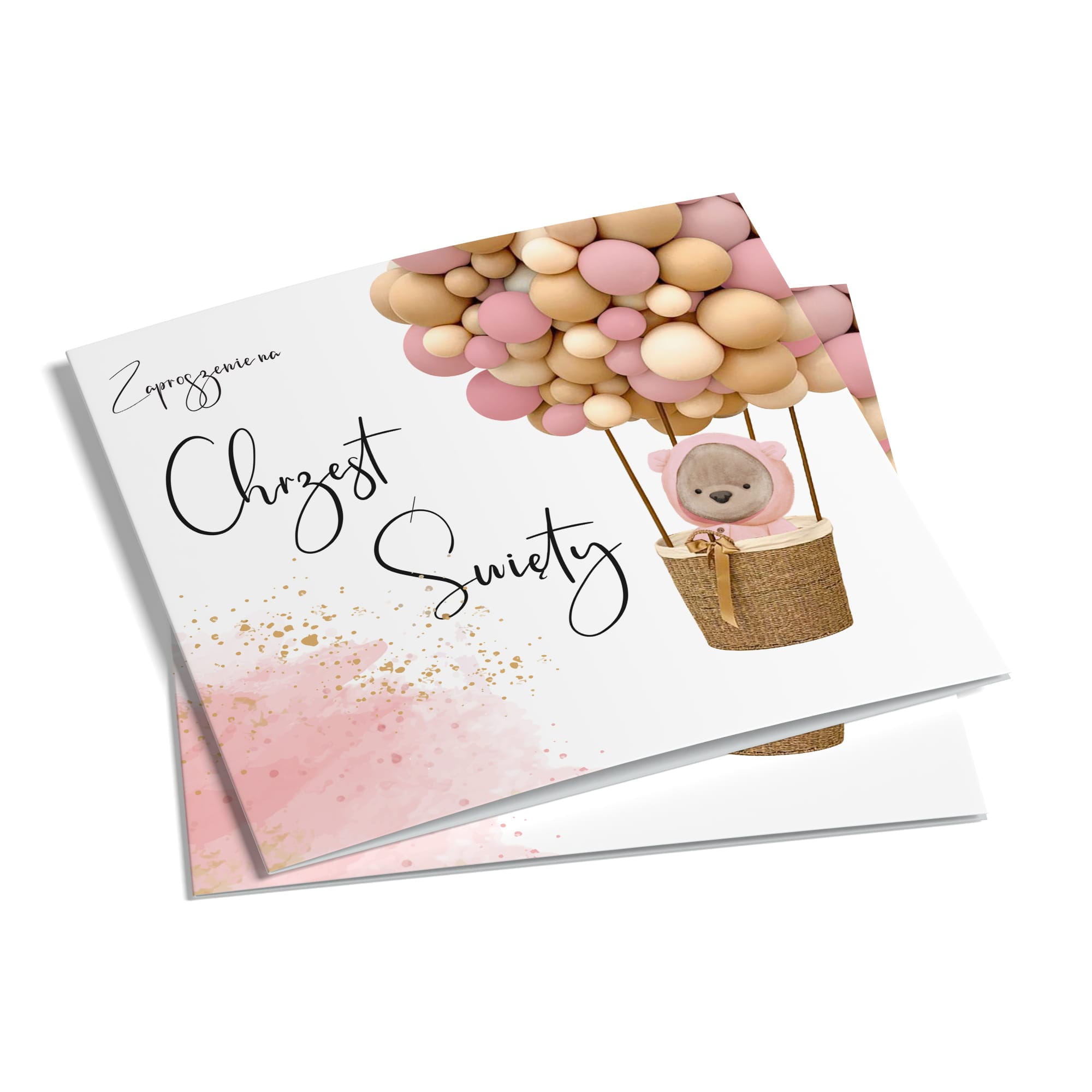 Delikatne zaproszenie na Chrzest Święty, zaprojektowane z myślą o dziewczynkach. Uroczy motyw misia w balonie w pastelowych odcieniach różu i beżu, uzupełniony złotymi detalami, tworzy harmonijną i elegancką kompozycję. Wnętrze zaproszenia jest przejrzyste, zawiera personalizowany tekst oraz inspirujący cytat, nadając zaproszeniu wyjątkowego charakteru.