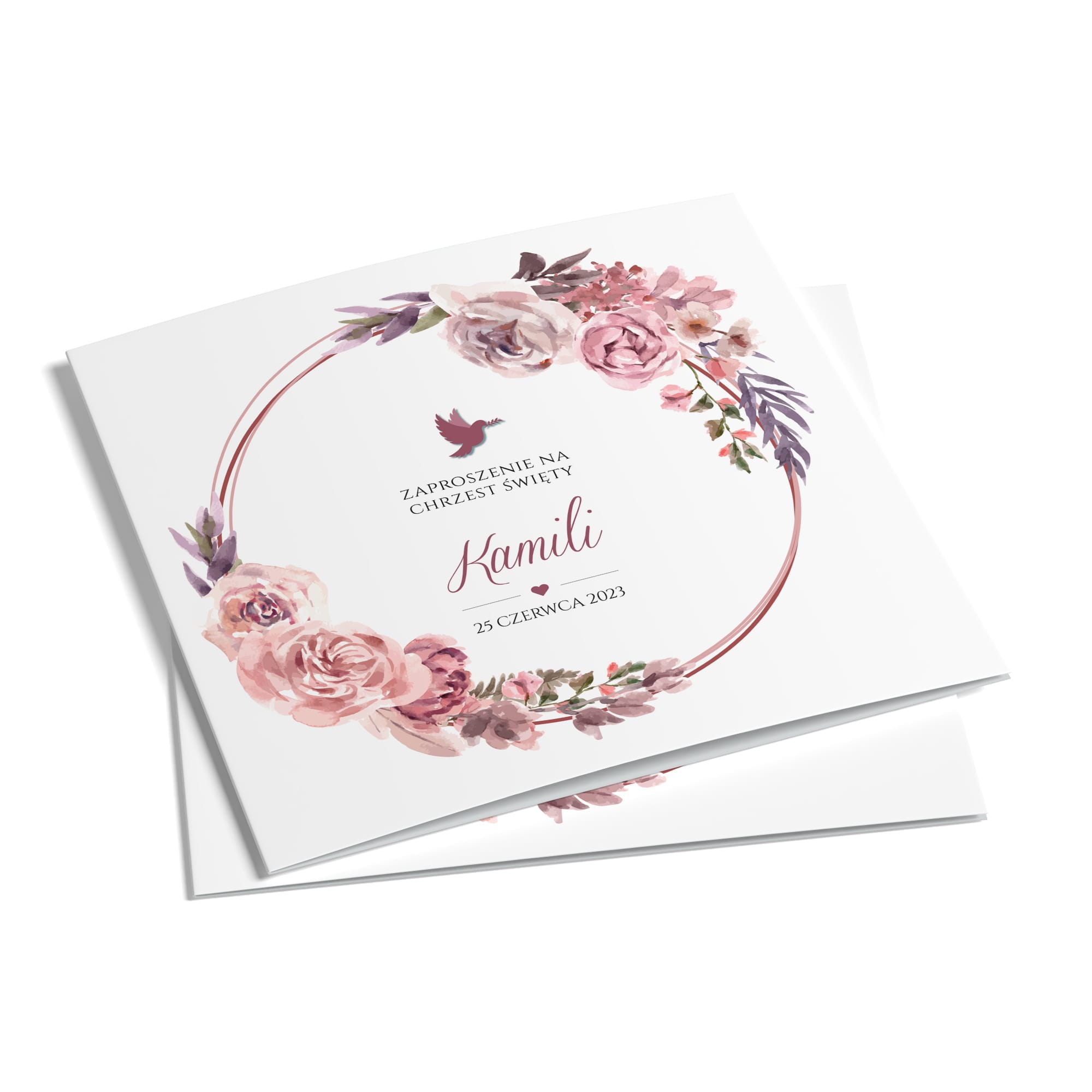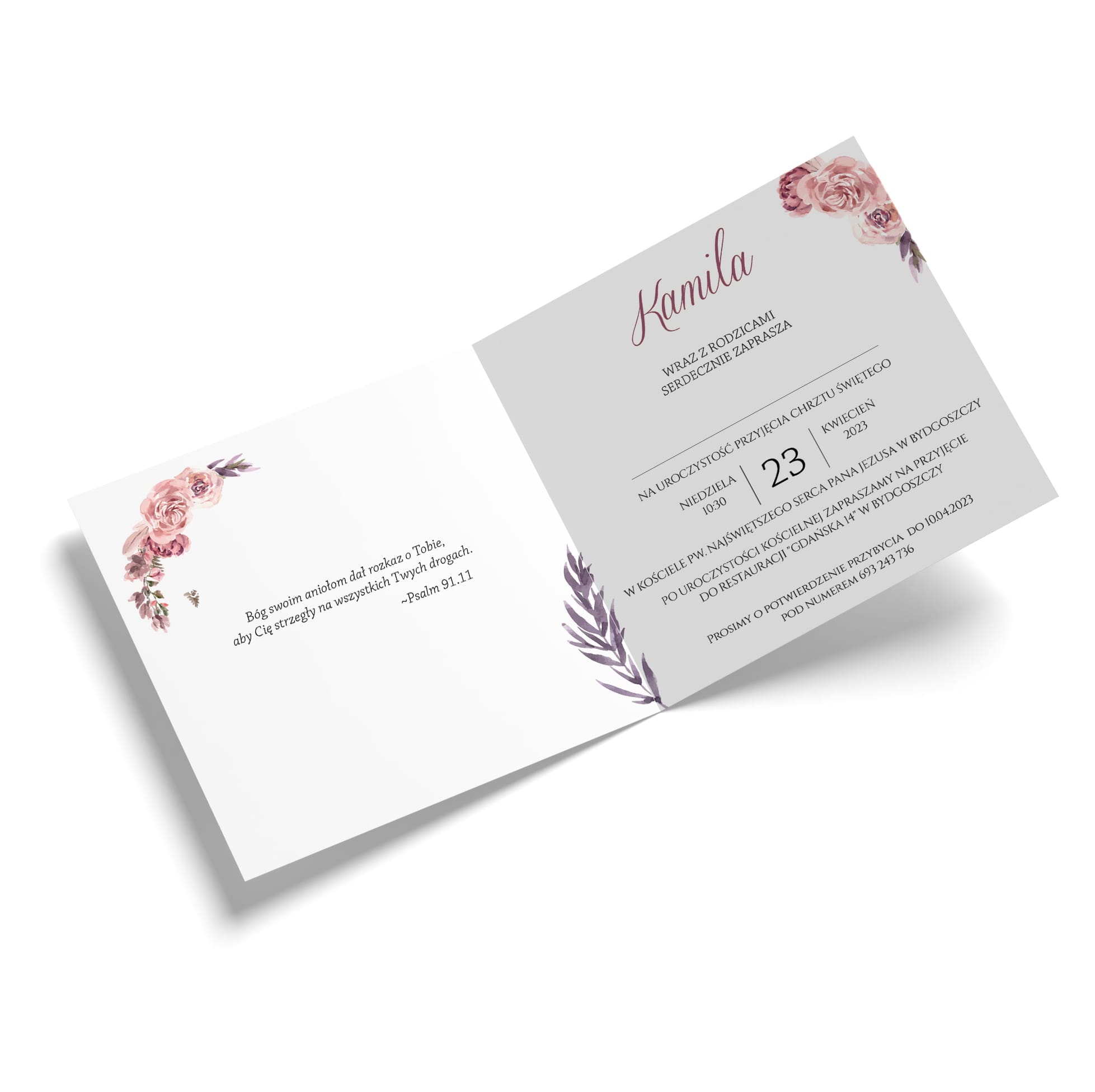 Zaproszenie na chrzest święty Z-CH-08 to delikatna i elegancka propozycja, która łączy w sobie subtelny urok florystycznych wzorów i pastelowych barw. Na okładce znajduje się piękna kompozycja róż w odcieniach różu i fioletu, otaczająca imię dziecka oraz datę uroczystości w harmonijnym, nowoczesnym układzie graficznym. Wnętrze zaproszenia zaprojektowano z myślą o klarownym i estetycznym przekazie treści – z jednej strony umieszczono dedykację z fragmentem psalmu, z drugiej szczegółowe informacje o uroczystości i przyjęciu.