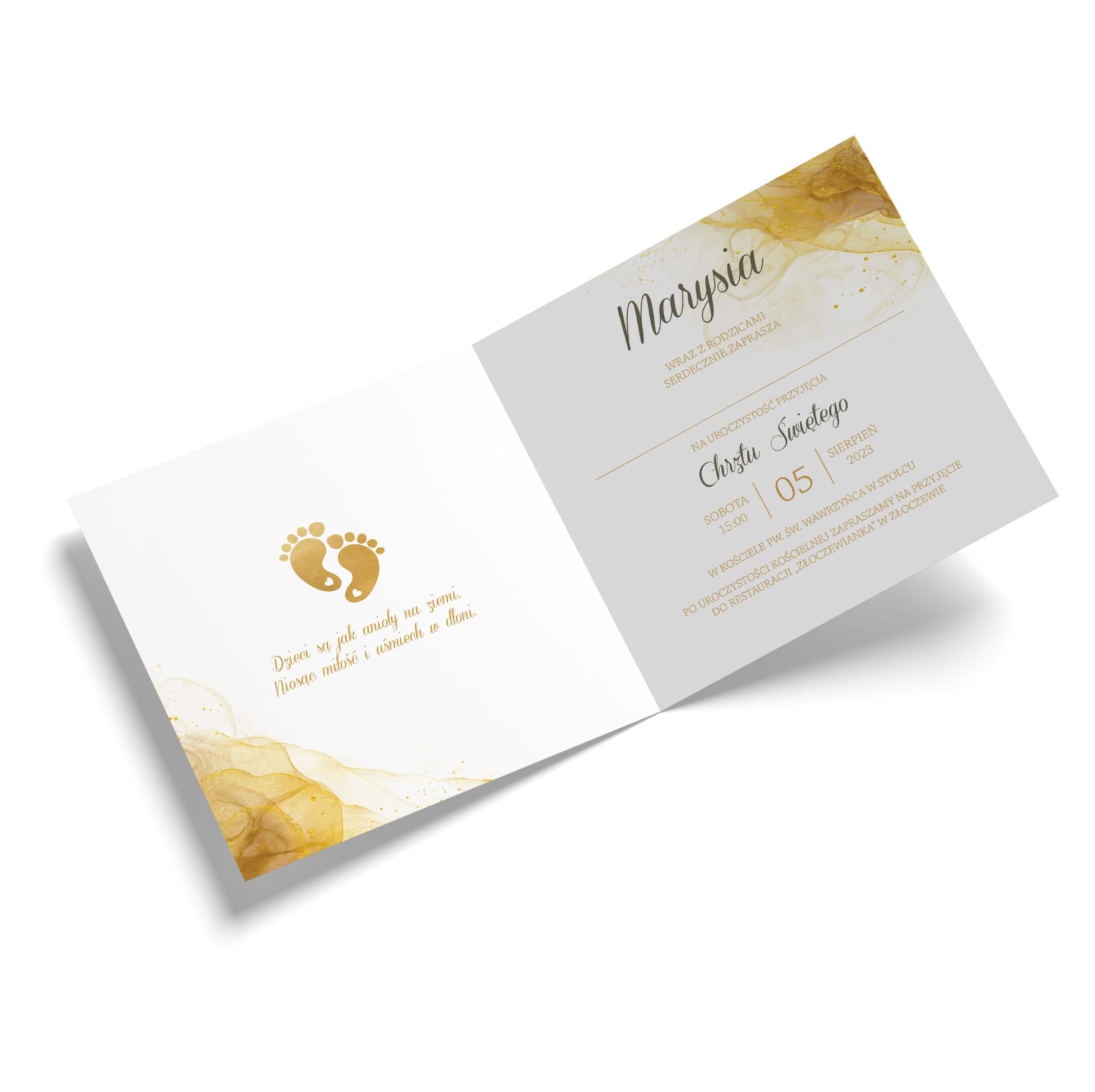 Zaproszenie na chrzest z eleganckim złotym motywem stóp i subtelnymi akwarelowymi wzorami to wyjątkowa propozycja na uczczenie tej ważnej uroczystości. Starannie zaprojektowane wnętrze pozwala na personalizację tekstu, dodając uroku i indywidualności. Wysoka jakość druku i wyjątkowy design sprawiają, że zaproszenie jest doskonałym wyborem dla każdego, kto ceni estetykę i dbałość o detale.