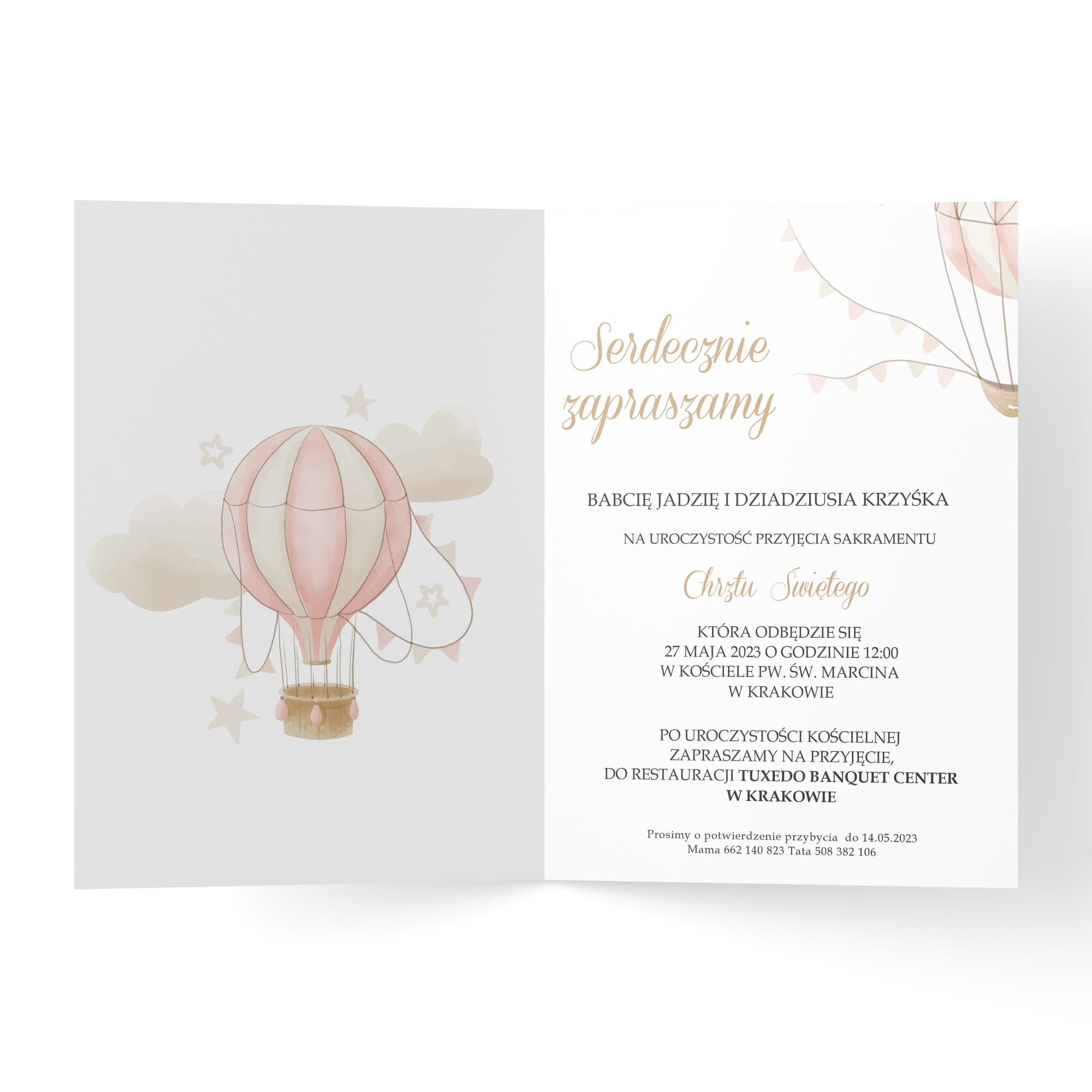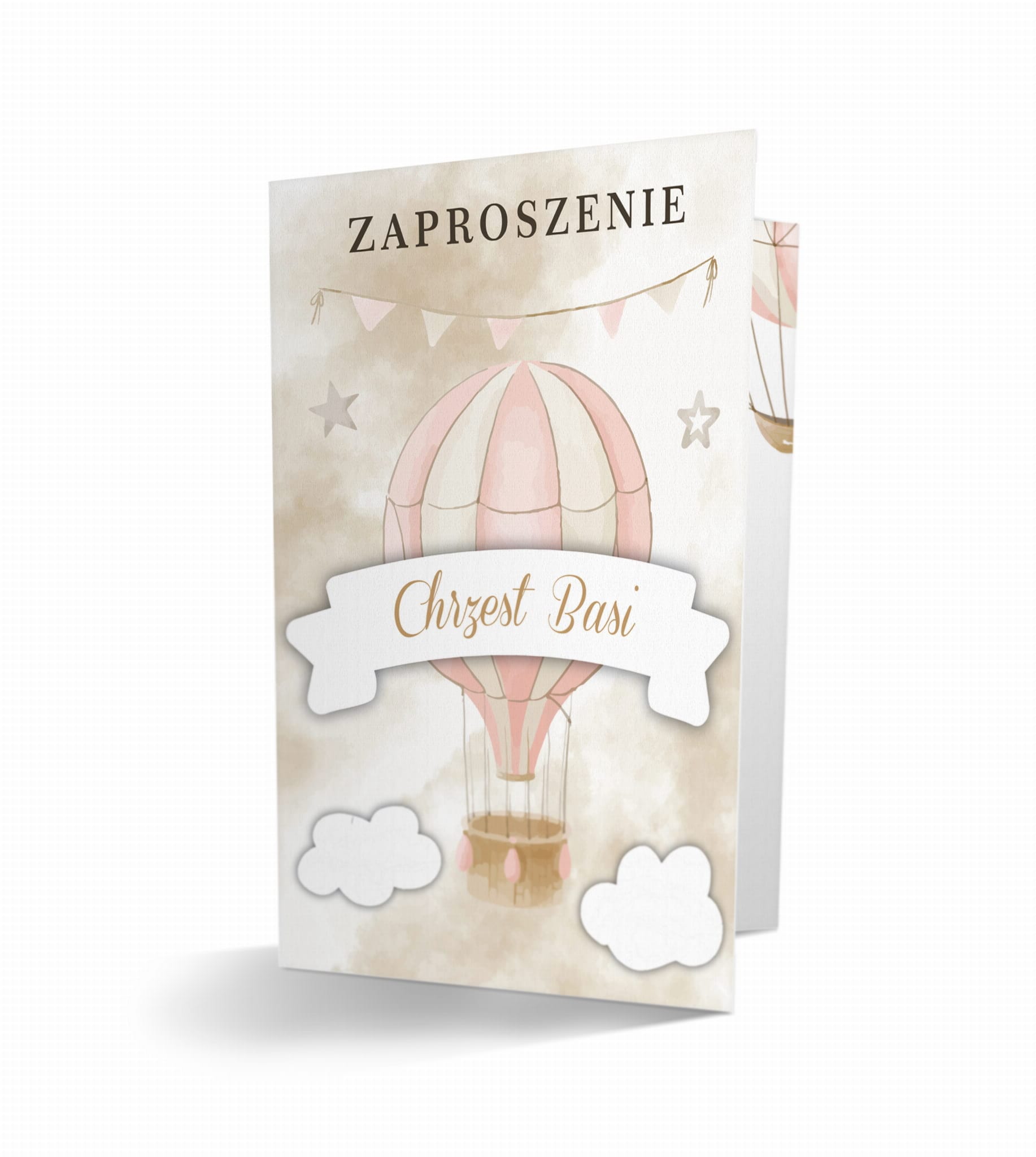 Zaproszenie na Chrzest Święty o delikatnym, beżowym motywie z uroczymi grafikami balonów i subtelnymi detalami, które dodają mu elegancji i ciepła. Na okładce znajduje się personalizowany napis z imieniem dziecka oraz urokliwy balon w pastelowych odcieniach różu i beżu, symbolizujący lekkość i radość. Wnętrze zaproszenia wyróżnia się starannie dobraną czcionką oraz harmonijną kompozycją tekstu, która w prosty sposób przekazuje wszystkie szczegóły uroczystości. Jest to idealny wybór dla osób, które poszukują subtelnego i estetycznego sposobu na zaproszenie najbliższych na ten wyjątkowy dzień.