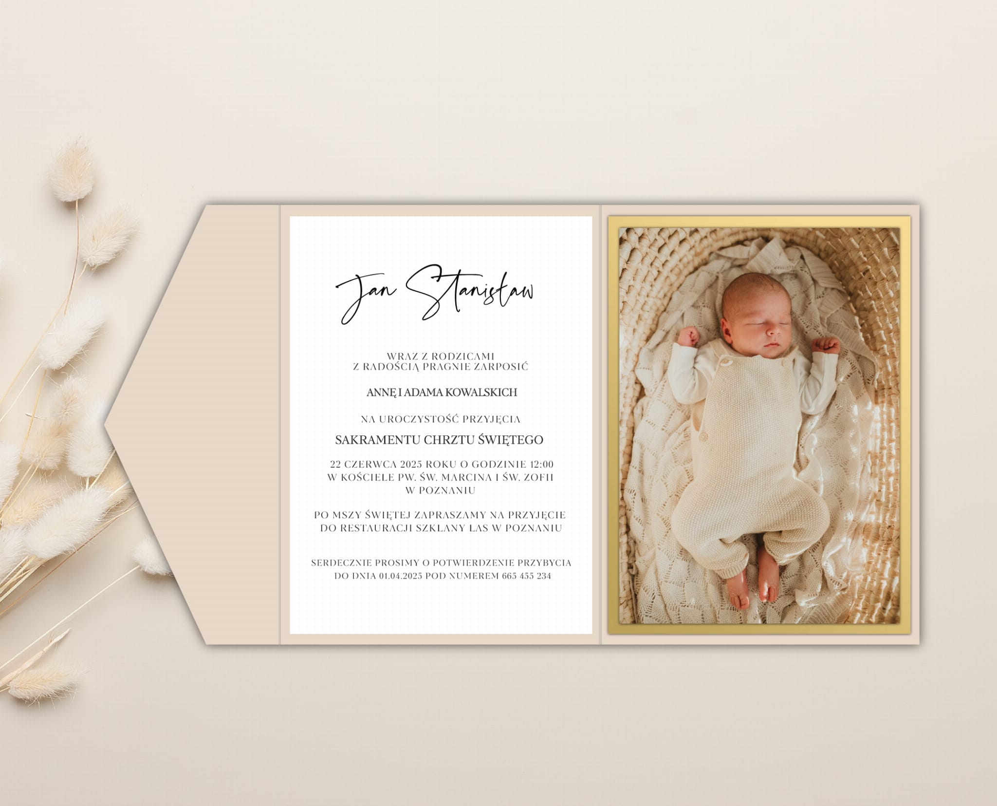 Zaproszenie w kształcie balonu to niezwykle urocza i oryginalna propozycja dla tych, którzy cenią nietuzinkowe rozwiązania. Elegancki design z delikatnymi pastelowymi kolorami i złotymi akcentami nadaje całości wyjątkowego charakteru. Ruchoma część balonika, połączona złotym kółeczkiem, sprawia, że zaproszenie jest nie tylko estetyczne, ale również interaktywne. Tekst umieszczony wewnątrz zawiera wszystkie niezbędne informacje dotyczące ceremonii chrztu świętego oraz przyjęcia. To idealny wybór na podkreślenie wyjątkowości tego szczególnego dnia.