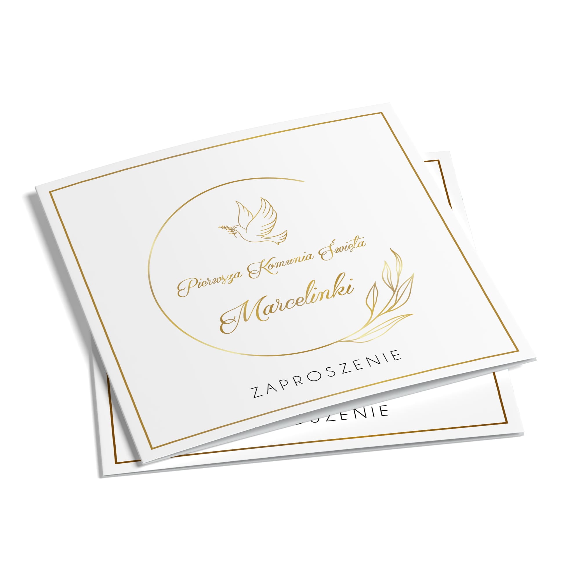 Eleganckie zaproszenie na chrzest w stylu minimalistycznym z delikatnymi niebieskimi akcentami florystycznymi oraz złotą geometryczną ramką. Imię dziecka wyróżnione nowoczesną, kaligraficzną czcionką, nadaje całości personalizowanego charakteru. Wykonane na wysokiej jakości papierze, idealne na uroczystość sakramentu Chrztu Świętego. Subtelne, a jednocześnie wyjątkowe – idealne, aby podkreślić wyjątkowość tego dnia.
