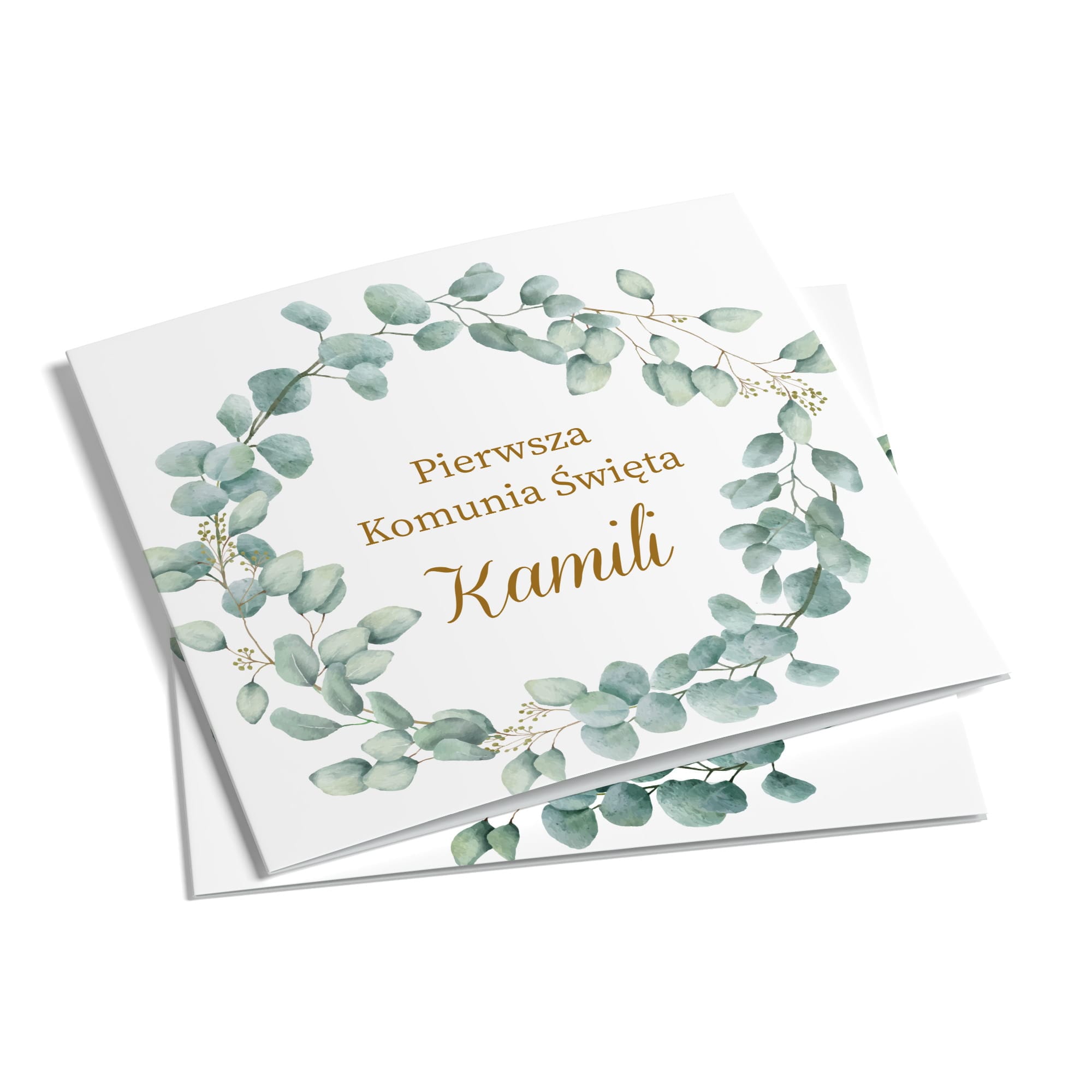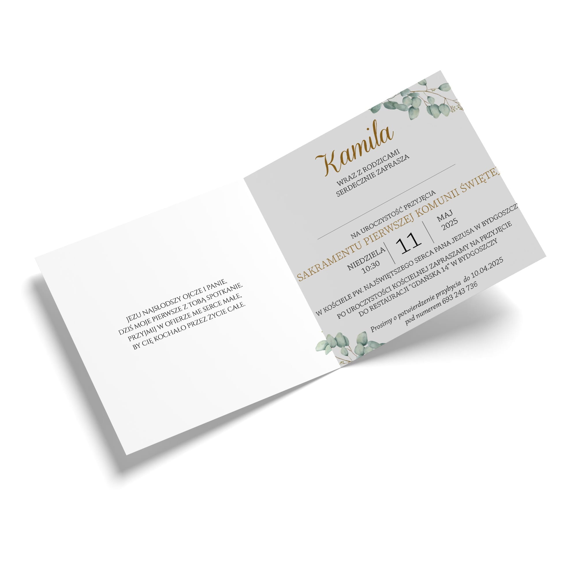 Eleganckie i subtelne zaproszenie komunijne z motywem akwarelowego wieńca z gałązek eukaliptusa. Delikatna kolorystyka, przejrzysty układ i klasyczna typografia sprawiają, że zaproszenie prezentuje się wyjątkowo naturalnie i stylowo. Doskonały wybór dla osób ceniących minimalizm i nowoczesną estetykę w duchowej oprawie.