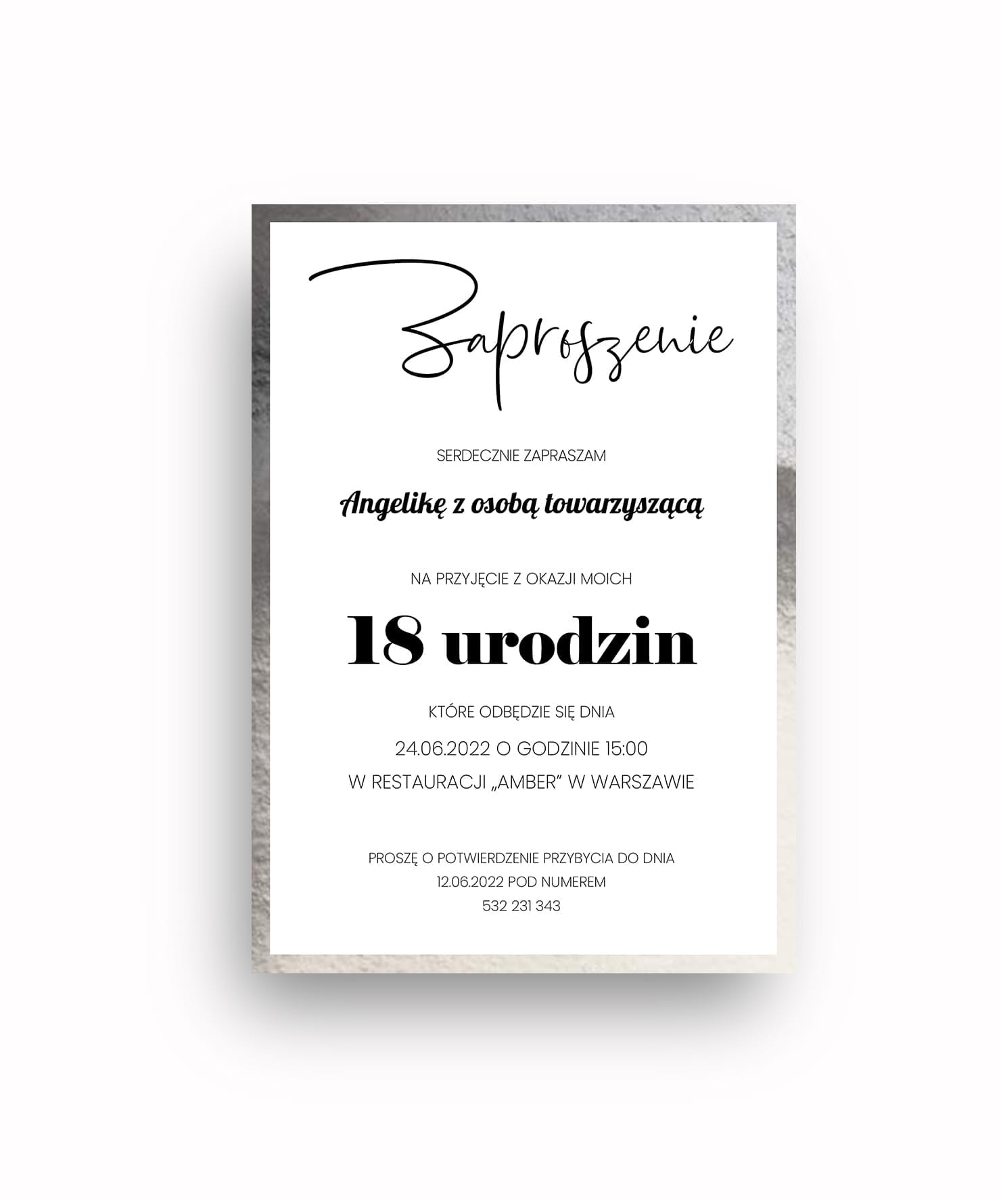 Zaproszenie na urodziny w stylu minimalistycznym i eleganckim. Projekt wykonany na białym tle z delikatną, srebrną ramką, która dodaje klasy i podkreśla wyjątkowy charakter wydarzenia. Centralny tekst w nowoczesnym układzie, łączącym subtelne, ręczne pismo z wyraźnym, klasycznym fontem, skupia uwagę na najważniejszych informacjach, takich jak okazja i data uroczystości. Srebrny akcent w ramce nadaje zaproszeniu stylowego, uniwersalnego wyglądu, idealnego na eleganckie przyjęcie z okazji urodzin.