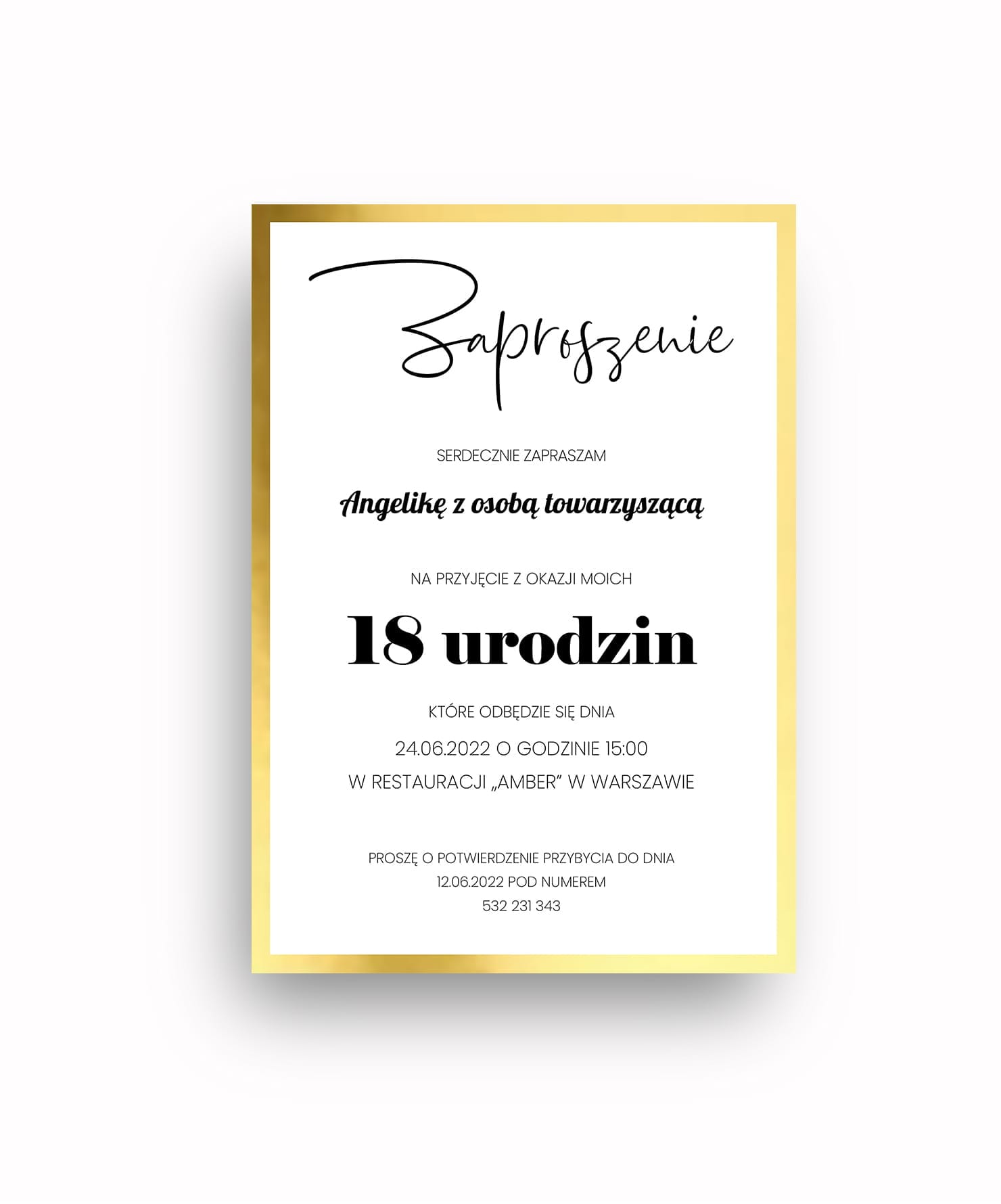 Zaproszenie na urodziny utrzymane w minimalistycznym, eleganckim stylu. Projekt wykonany na białym tle z subtelną, złotą ramką, która dodaje szyku i podkreśla wyjątkowy charakter okazji. Centralną część zajmuje tekst w nowoczesnym kroju pisma, łączącym delikatne, ręczne pismo z wyraźnym, klasycznym fontem w akcentach, takich jak „18 urodziny”. Dzięki prostej formie i eleganckiej kolorystyce zaproszenie sprawia wrażenie wyrafinowanego i ponadczasowego, idealnego na wyjątkową okazję.