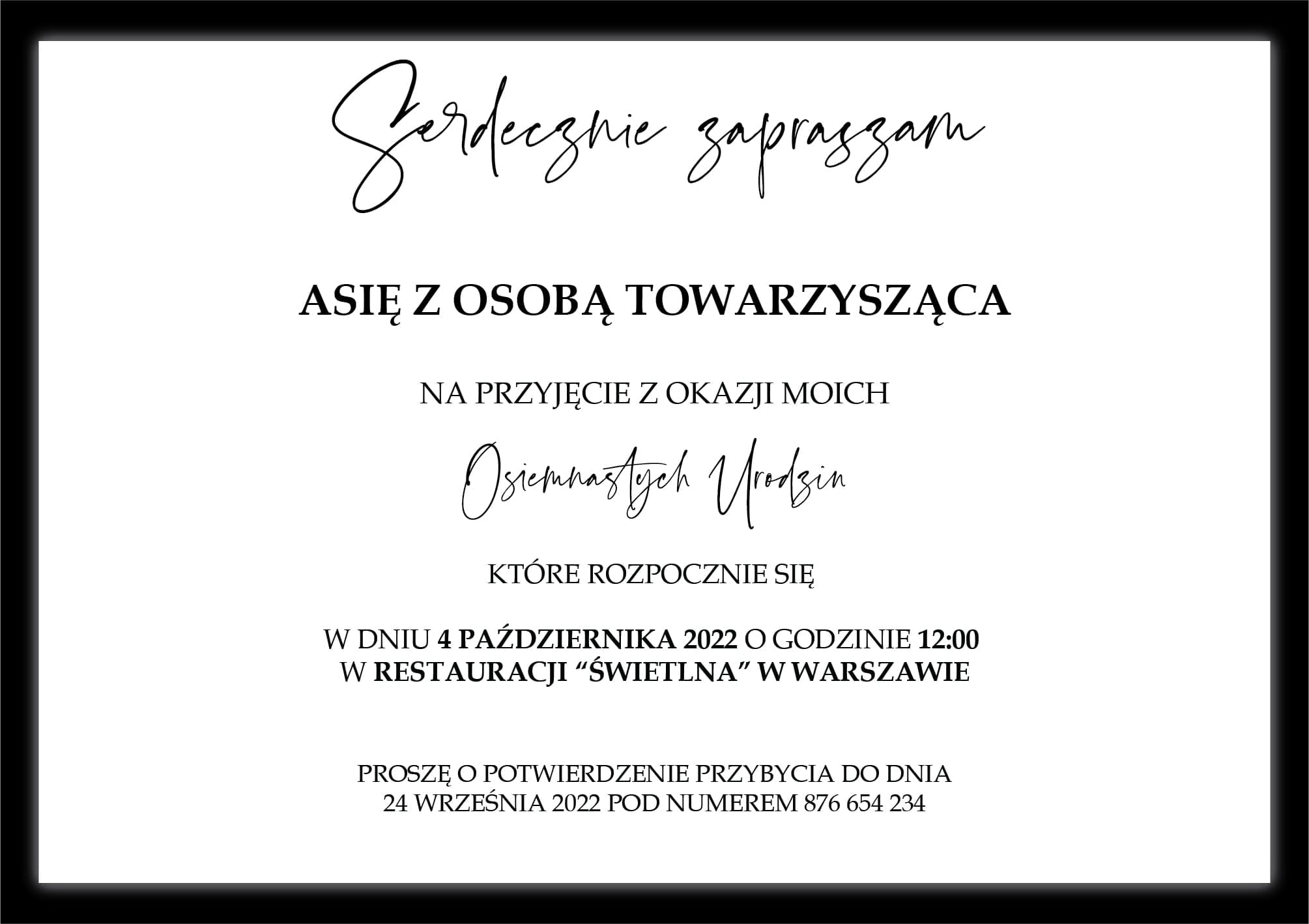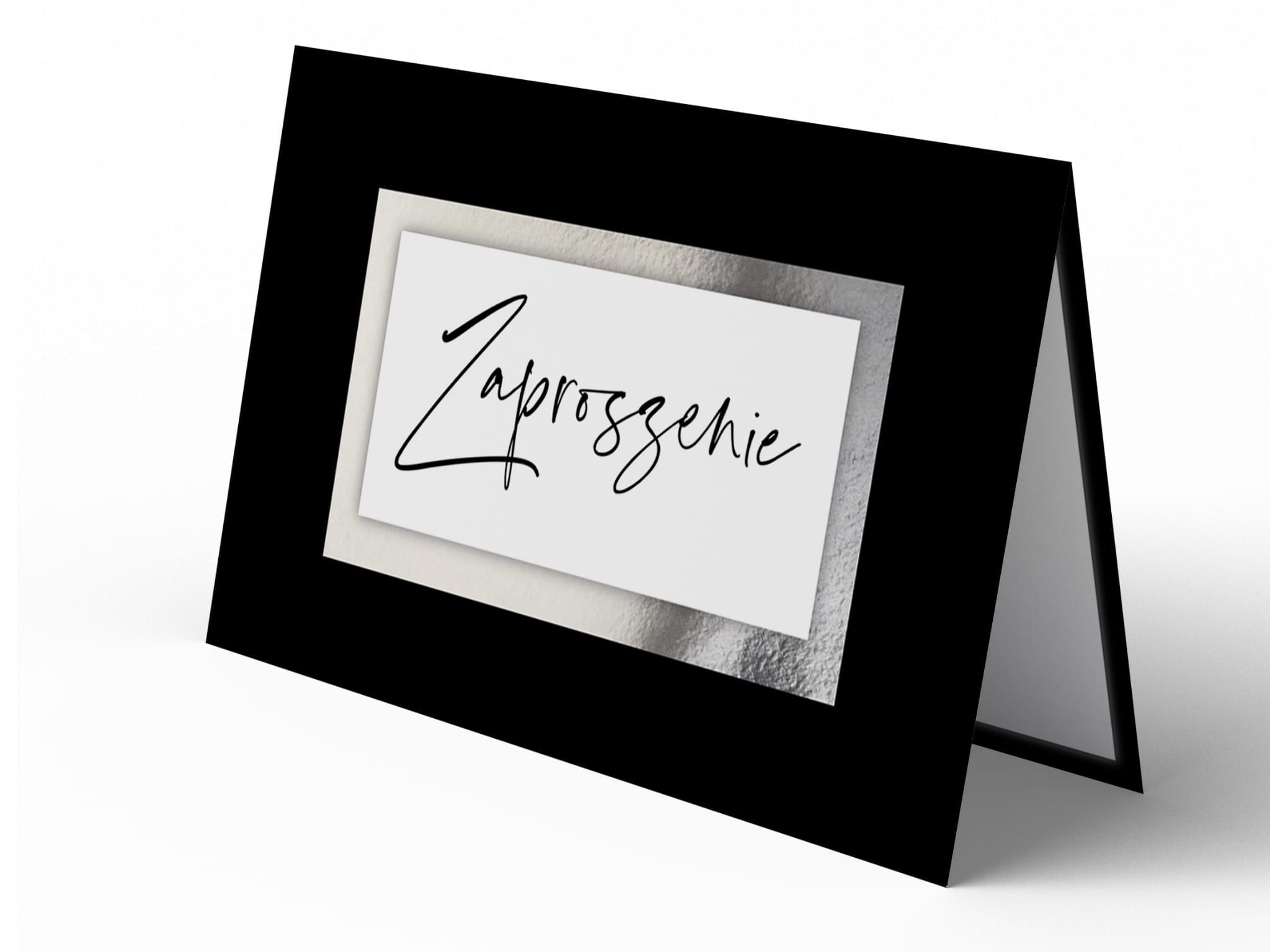 Zaproszenie w eleganckiej kolorystyce czerni i srebra, idealne na wyjątkowe uroczystości. Na froncie zaproszenia widnieje minimalistyczny napis „Zaproszenie” w efektownej ramce, wykonany w eleganckim stylu. Wnętrze zaproszenia utrzymane w klasycznej czerni i bieli zawiera czytelny tekst zaproszenia napisany delikatną, nowoczesną czcionką.