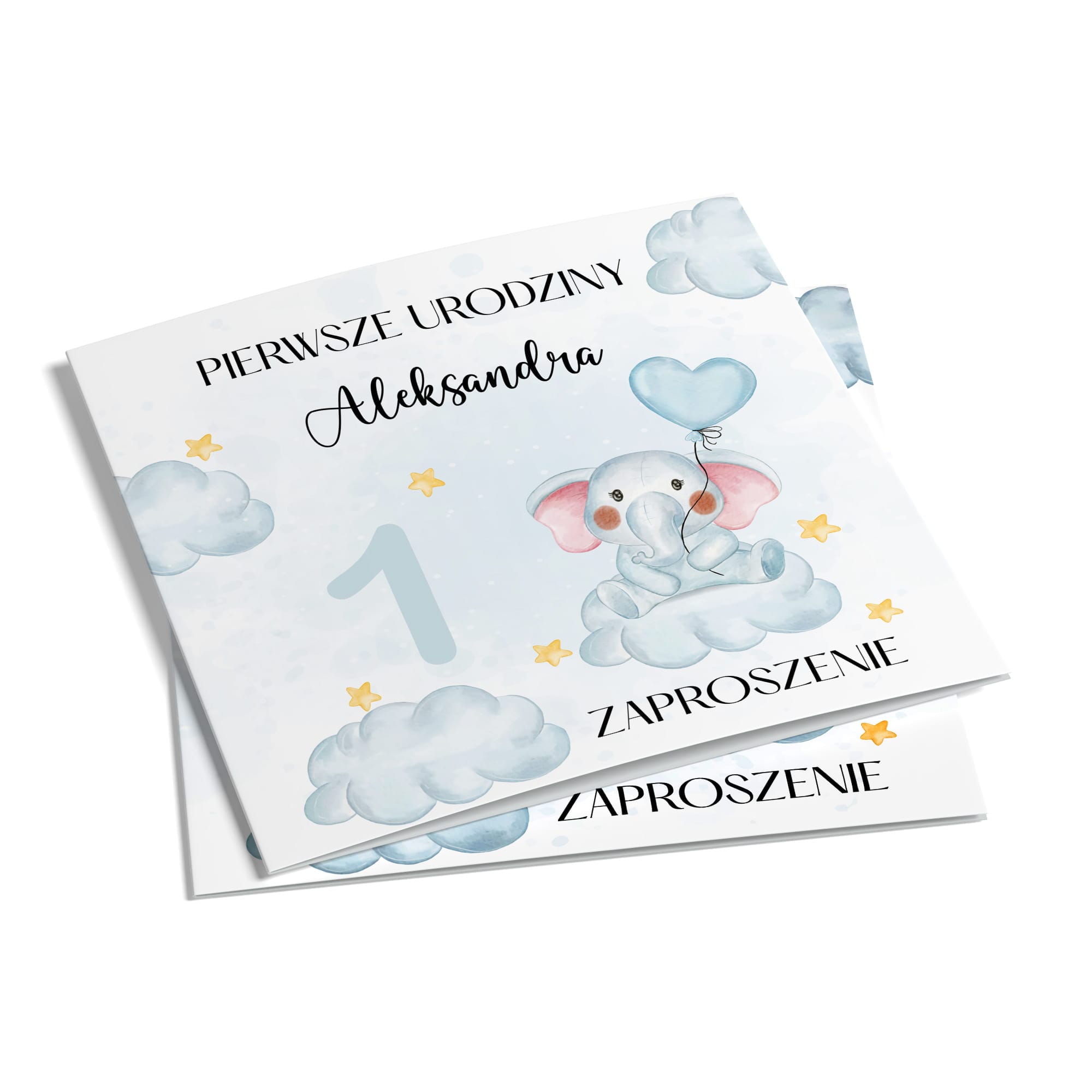 Pierwsze urodziny to wyjątkowe wydarzenie w życiu dziecka i całej rodziny – zasługują na równie wyjątkową oprawę. To zaproszenie z uroczym słonikiem siedzącym na chmurce i trzymającym balonik w kształcie serca z pewnością wprowadzi Twoich gości w radosny, dziecięcy klimat.